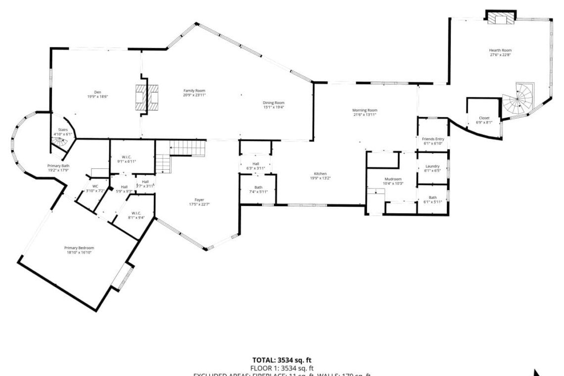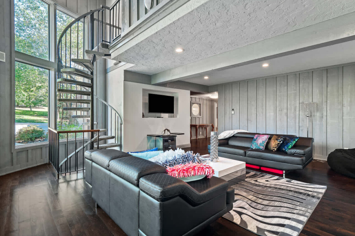 The hearth room/family room provides an intimate seating area with another decorative fireplace with a TV above — perfect for morning coffee or quiet conversation. A spiral staircase here leads to bedroom 2.