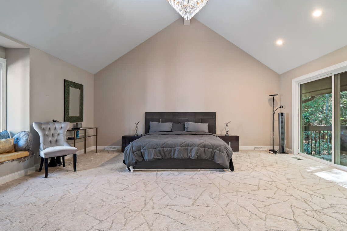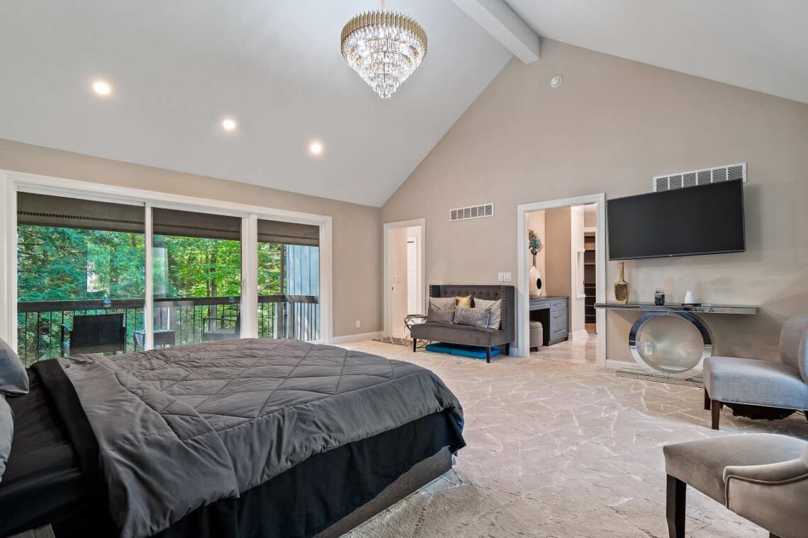The main-floor master suite offers a true retreat, complete with a king bed, spa-inspired bathroom, walk-in steam shower, and soaking tub. Sliding doors open directly to the deck, where you can enjoy your morning coffee surrounded by peaceful wooded views.