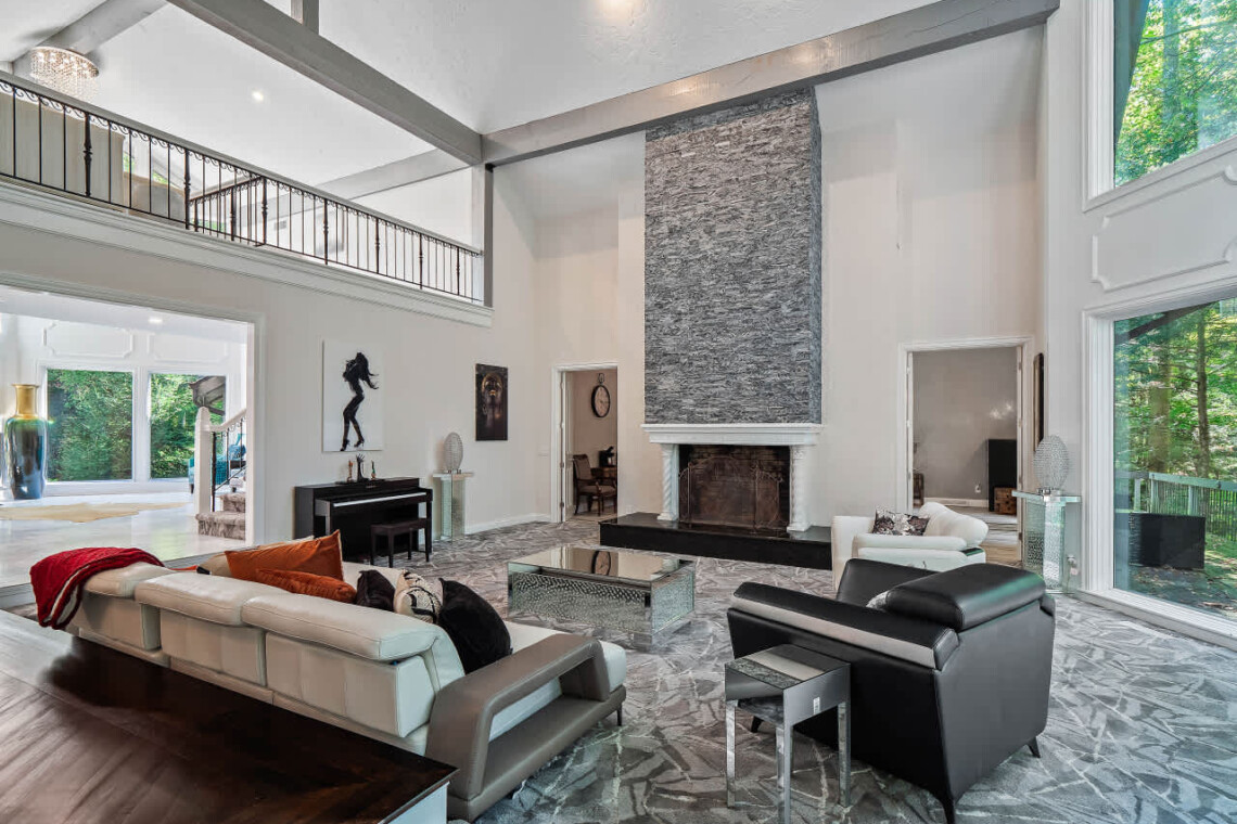 -Two-story decorative stone fireplace & multiple living spaces