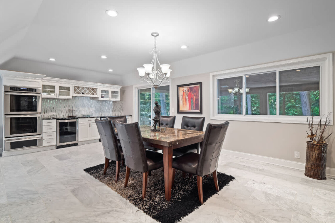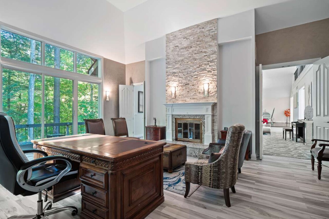 Step inside to a stunning open family room featuring soaring ceilings, a two-story decorative stone fireplace, and cozy seating that overlooks the private deck and backyard. There is a dining space for up to 6 in this room as well. Off of the family room is a large office with a spiral staircase leading to a charming observatory, a hidden gem with panoramic views and a cozy nook ideal for reading or unwinding. The gourmet kitchen is a chef’s dream with a large island, double ovens, bar area with wine and beer fridges, and plenty of counter space for preparing and sharing meals. A dining area for six sits adjacent to the kitchen, and there are two convenient half baths on this level.