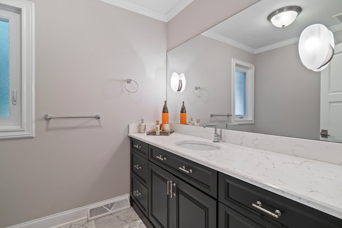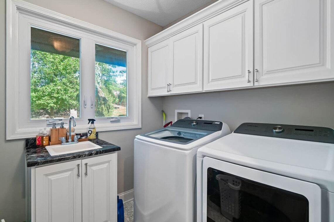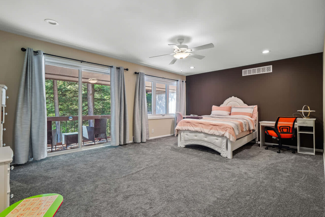 The walk-out basement includes a bar room with seating around a brick fireplace, creating a cozy space for entertaining. You’ll also find a dedicated workout area, and access to a large patio that opens onto the private backyard.