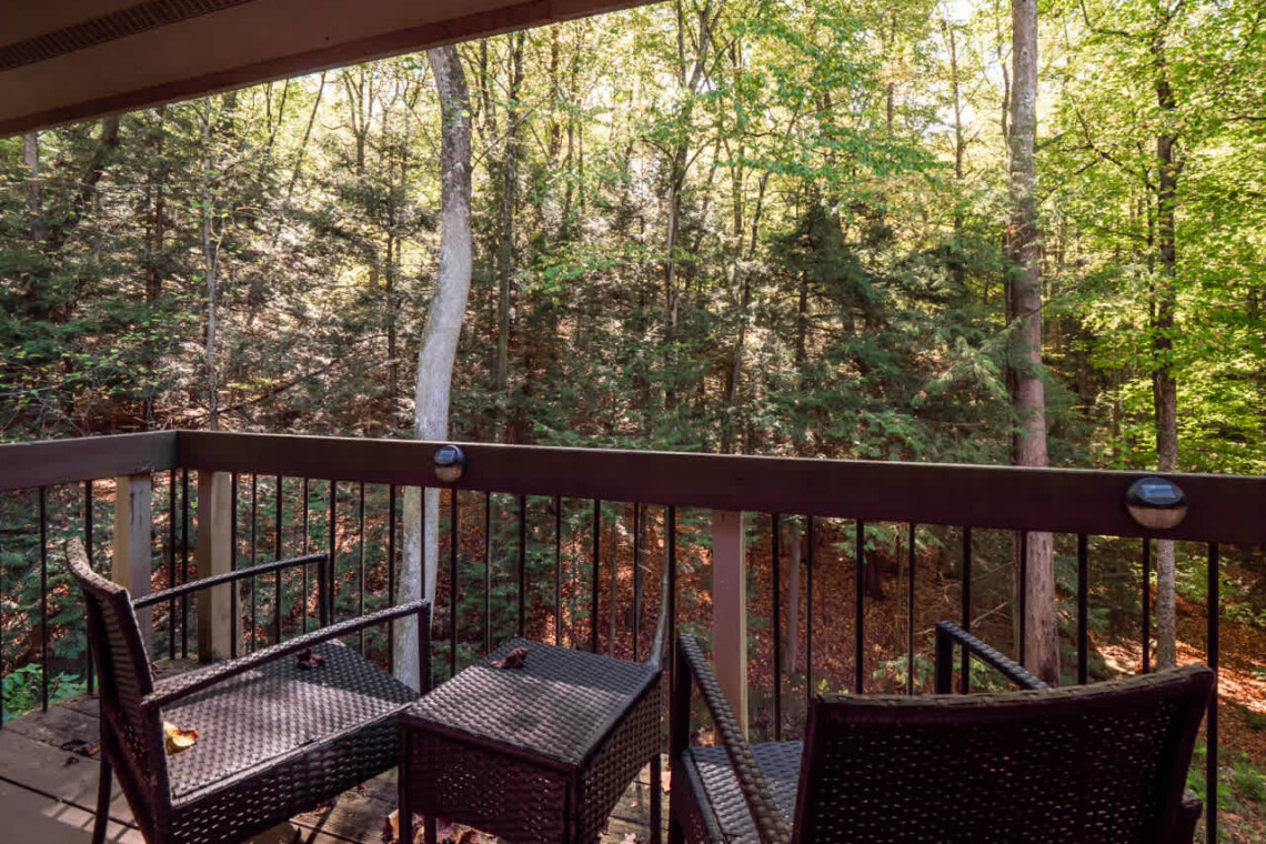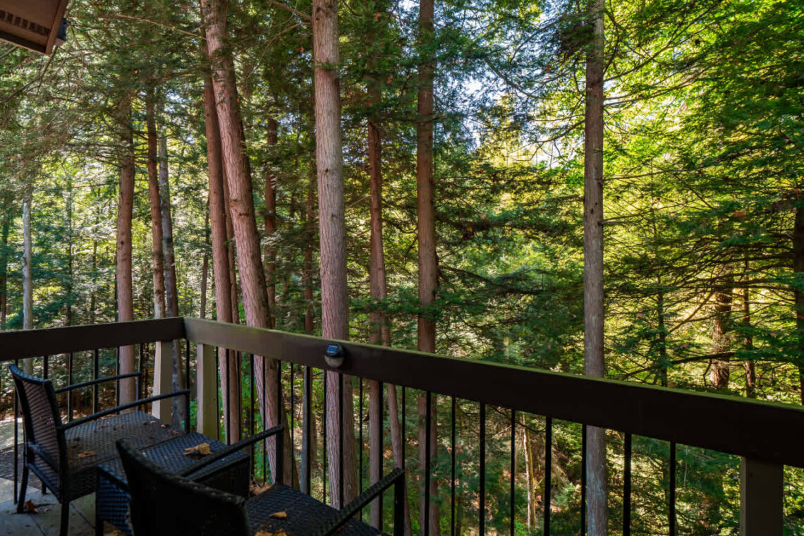 Up above, the spacious deck offers additional seating and wooded views — ideal for relaxing or simply enjoying the peace of nature.
