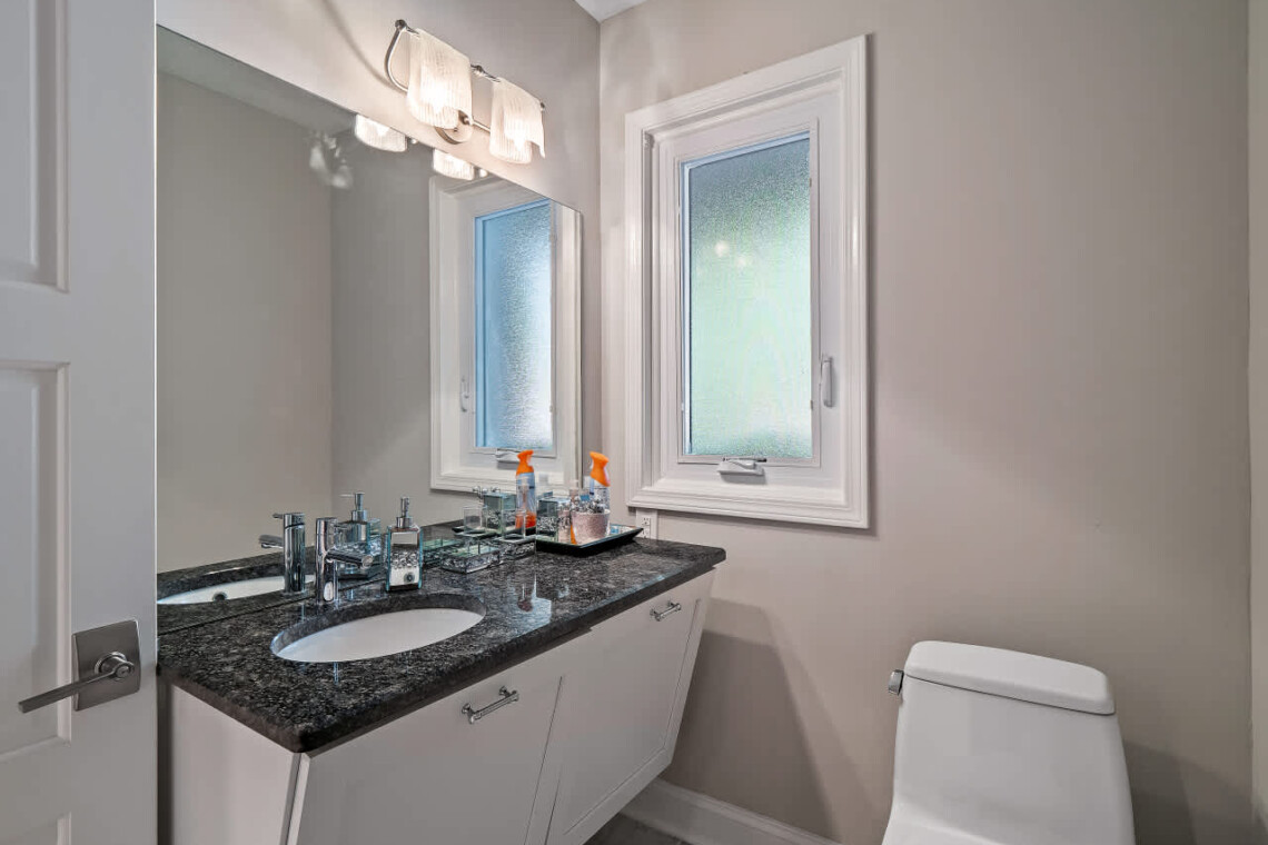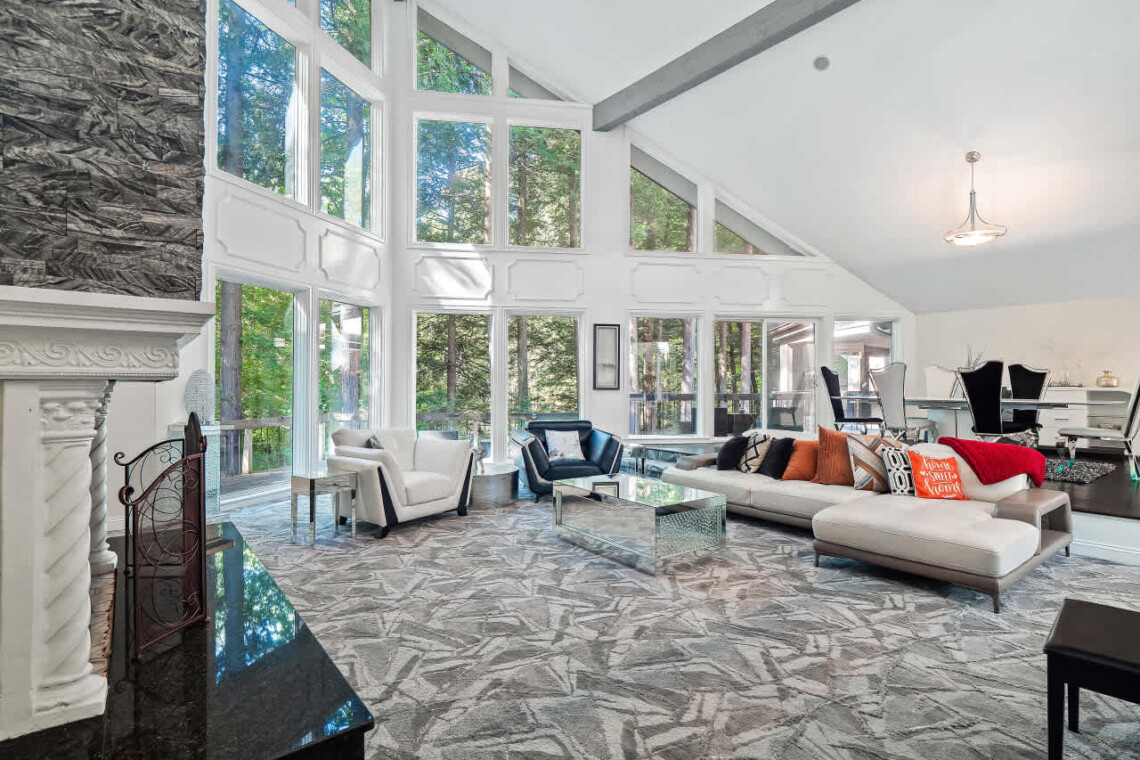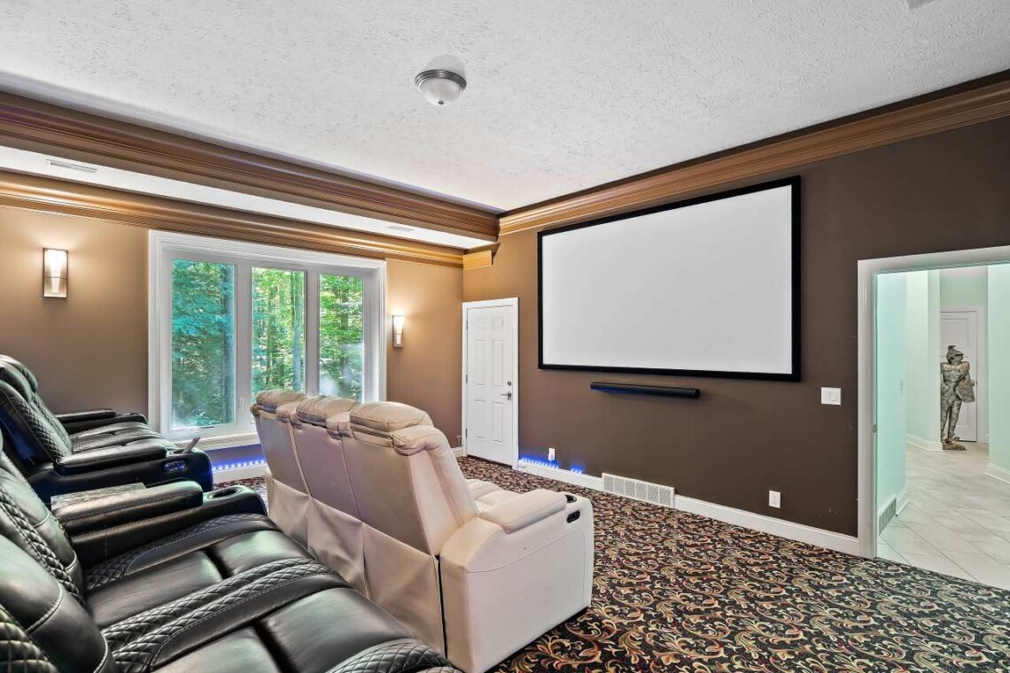On the lower level you’ll find the indoor heated pool, complete with depths of up to 10 feet — perfect for year-round enjoyment. Nearby, you’ll find a sauna, a full bathroom with walk-in shower, and a home movie theater with seating for nine.
