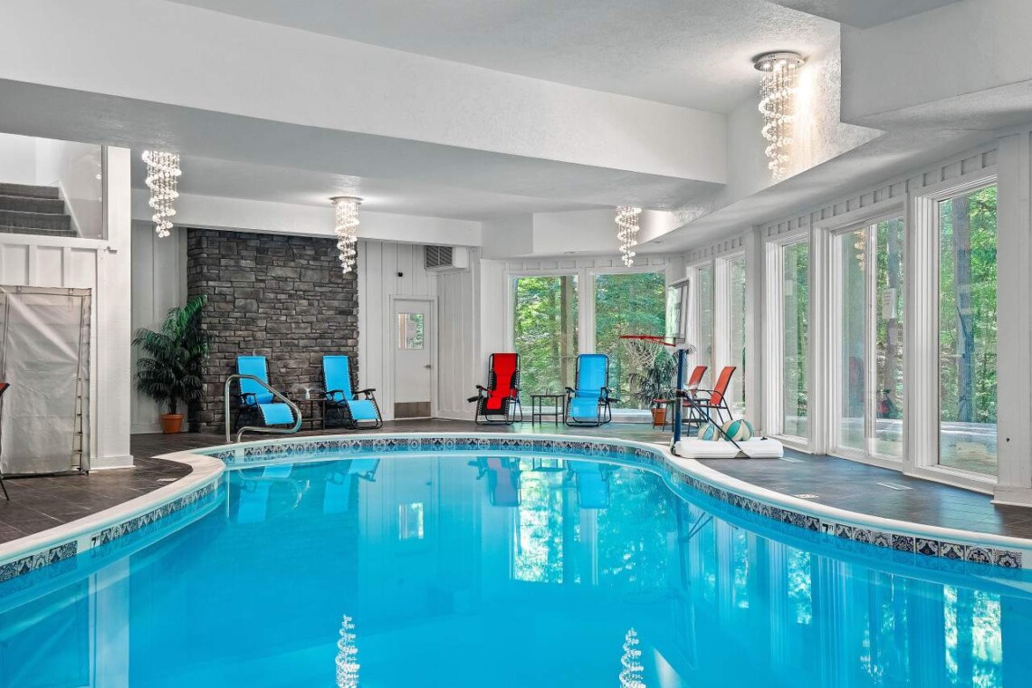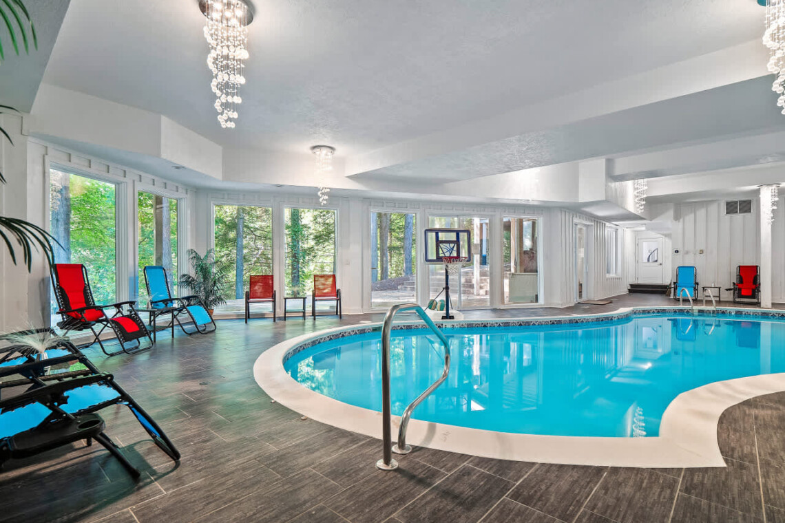 Escape to this extraordinary 5-bedroom luxury retreat, where comfort, privacy, and resort-style amenities come together for an unforgettable stay. Nestled on a secluded wooded lot, this spacious home is designed for both relaxation and entertainment — complete with an indoor heated pool, sauna, home theater, workout space, and multiple inviting gathering areas perfect for every season.