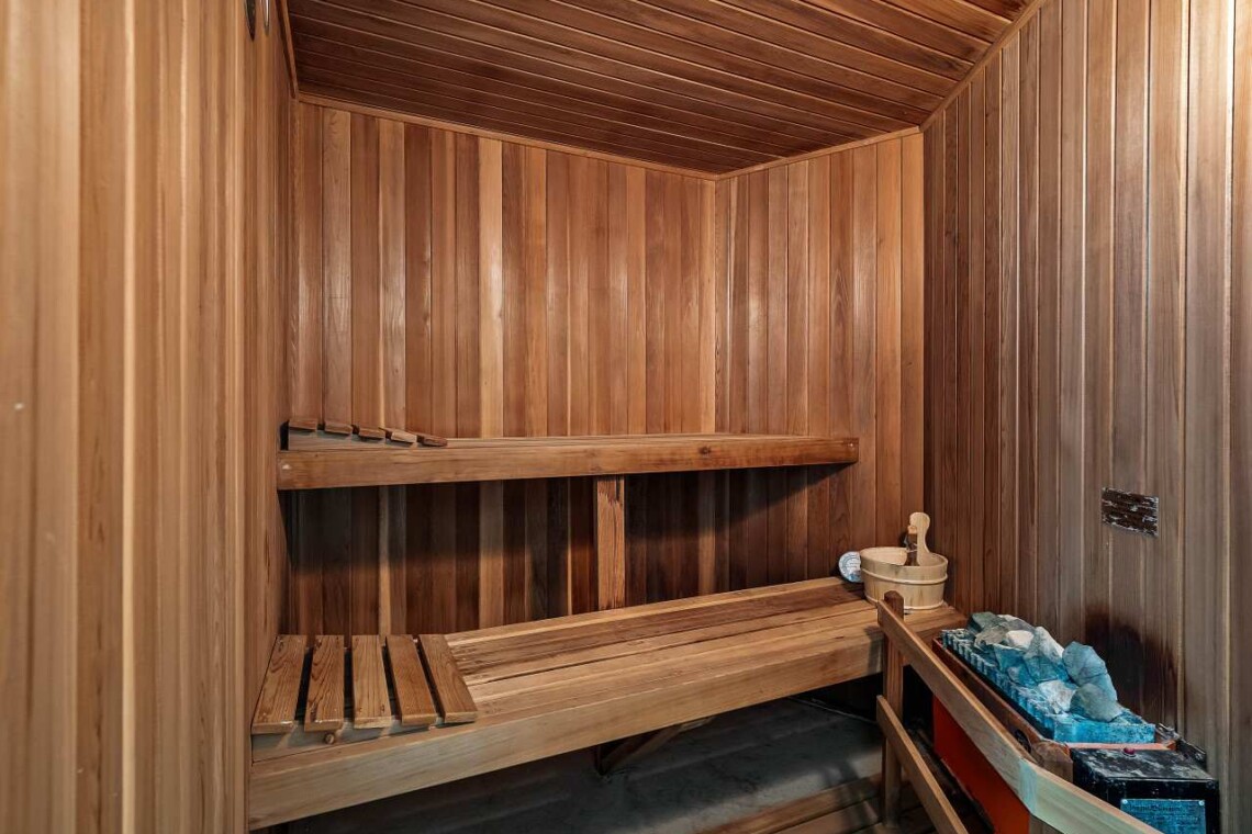 The sauna is right across from the lower-level steam room.