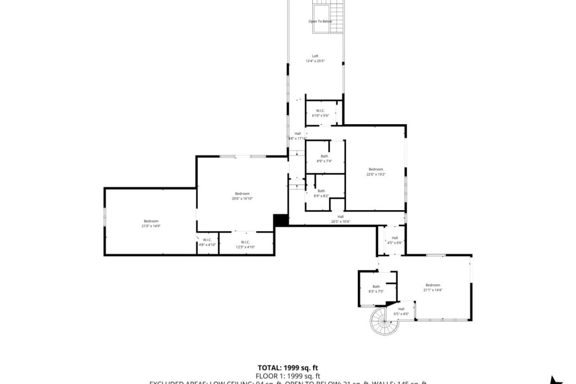 Bedroom 2: Accessible via a spiral staircase from the hearth room or from the main entry hall, featuring a king bed and private bathroom with tub/shower combo.