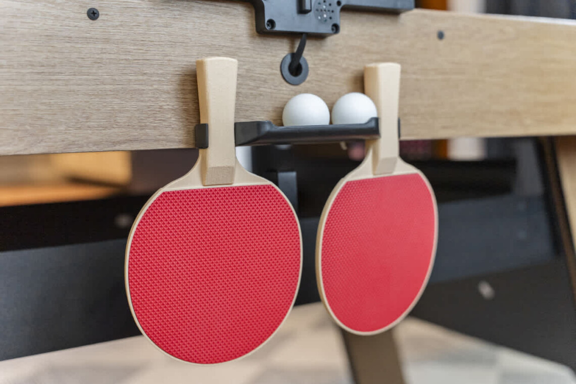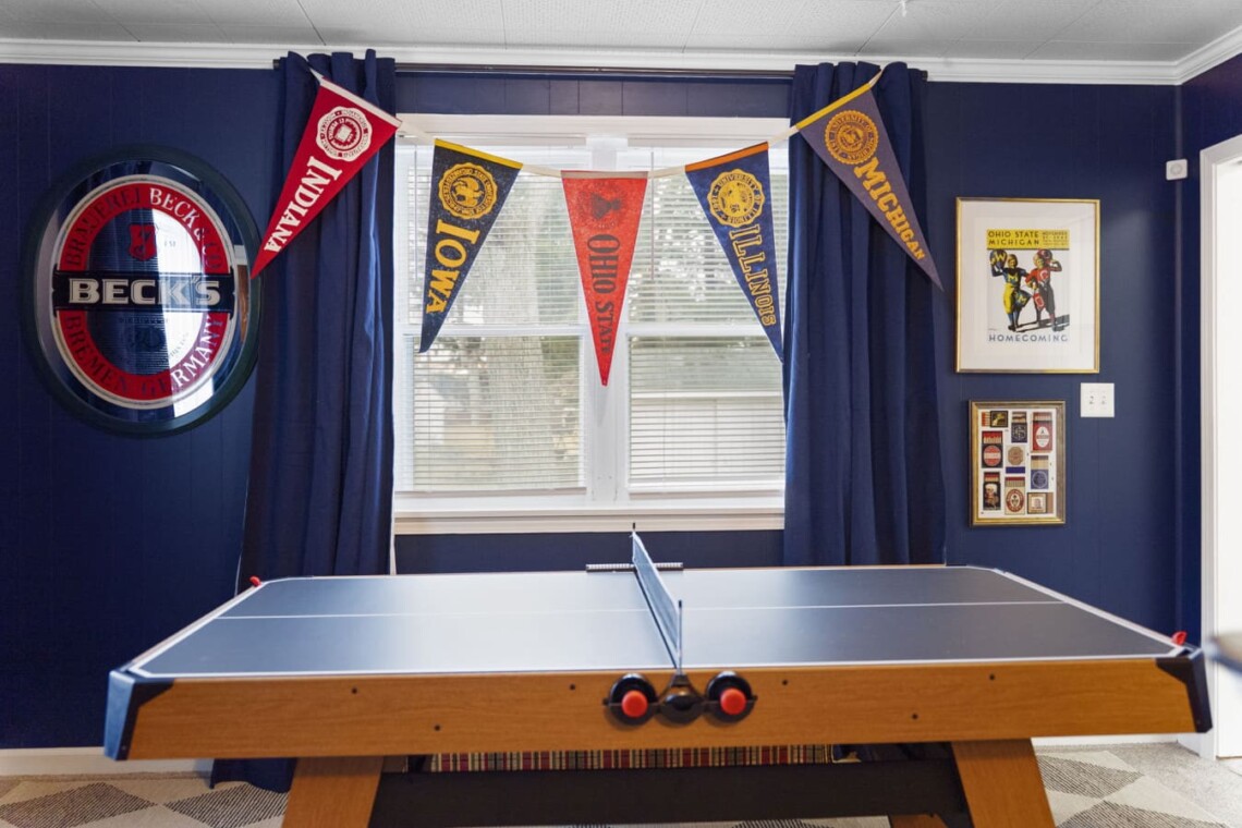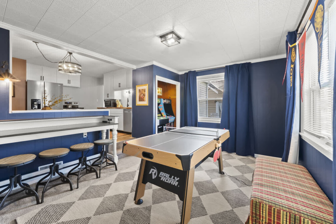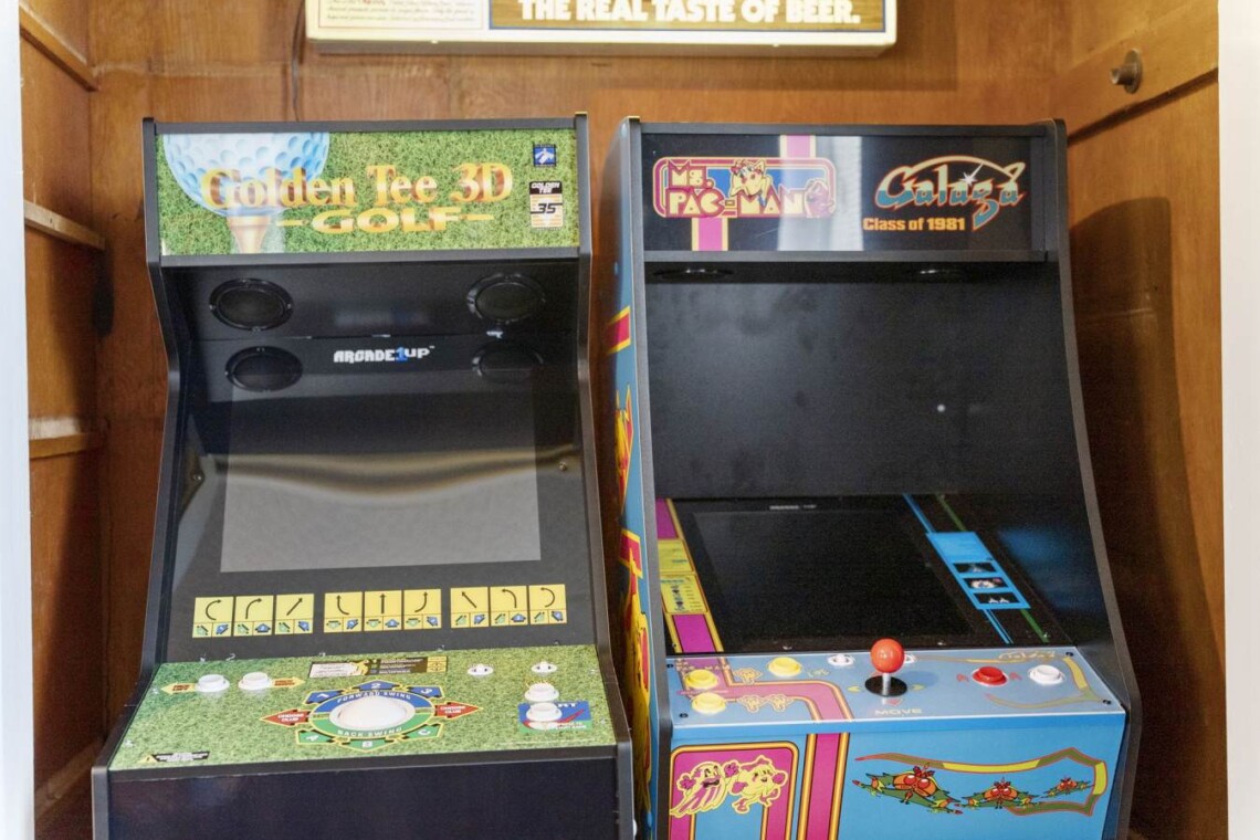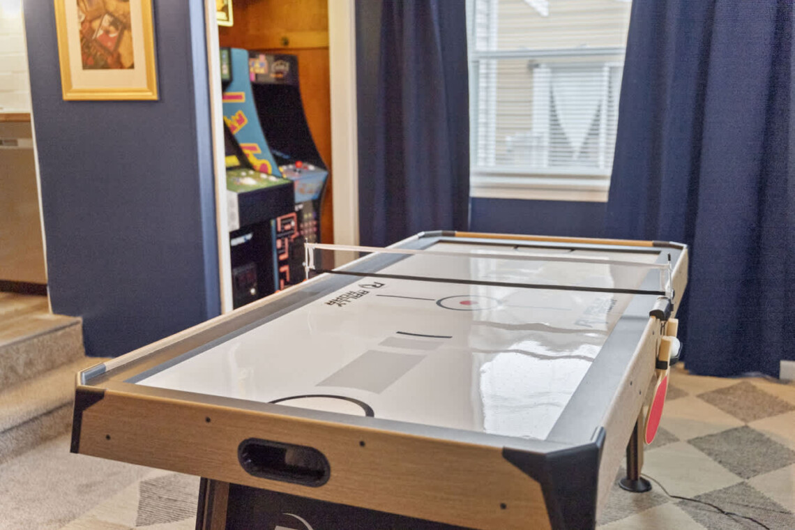 The first floor is designed for fun and flexibility, making it a great setup for kids, teens, or anyone who wants to stay close to the entertainment. The dedicated game room features a ping-pong table, air hockey, and two retro arcade machines loaded with Golden Tee Golf, Pac-Man, and Galaga—a favorite for guests of all ages.