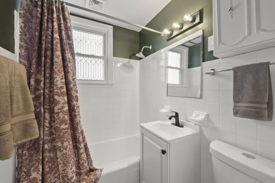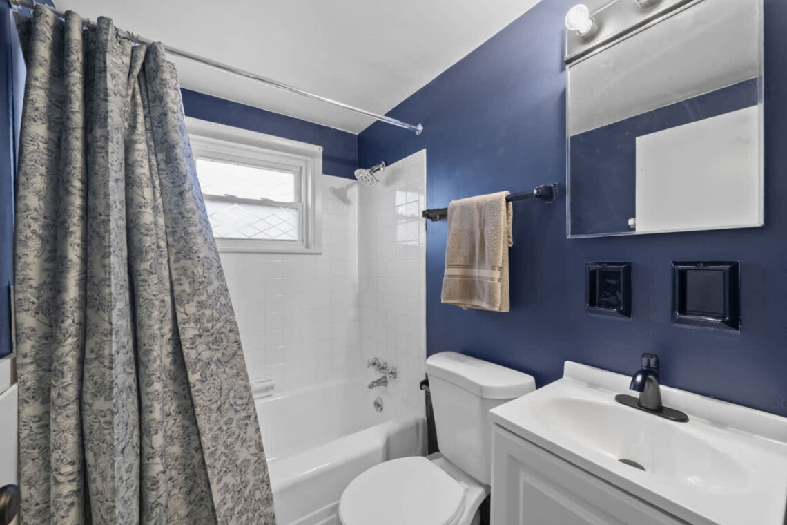A full bathroom on the first floor is conveniently located near the bedrooms and game room.