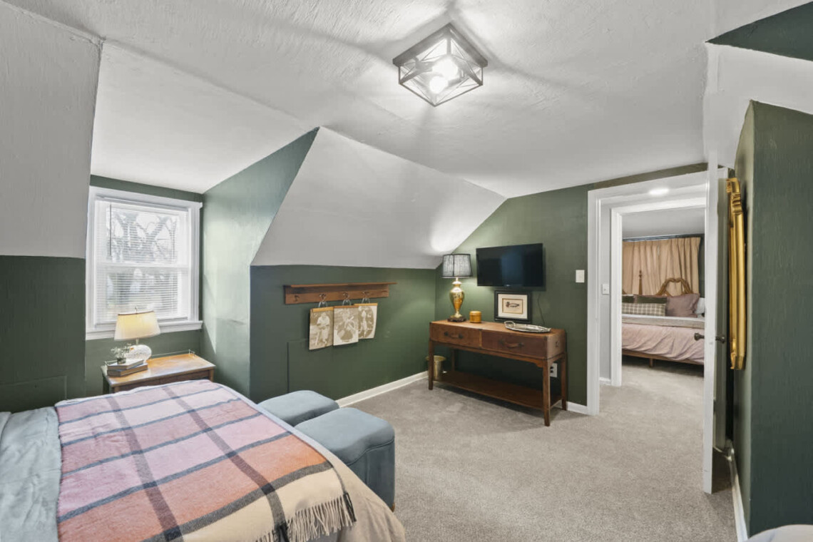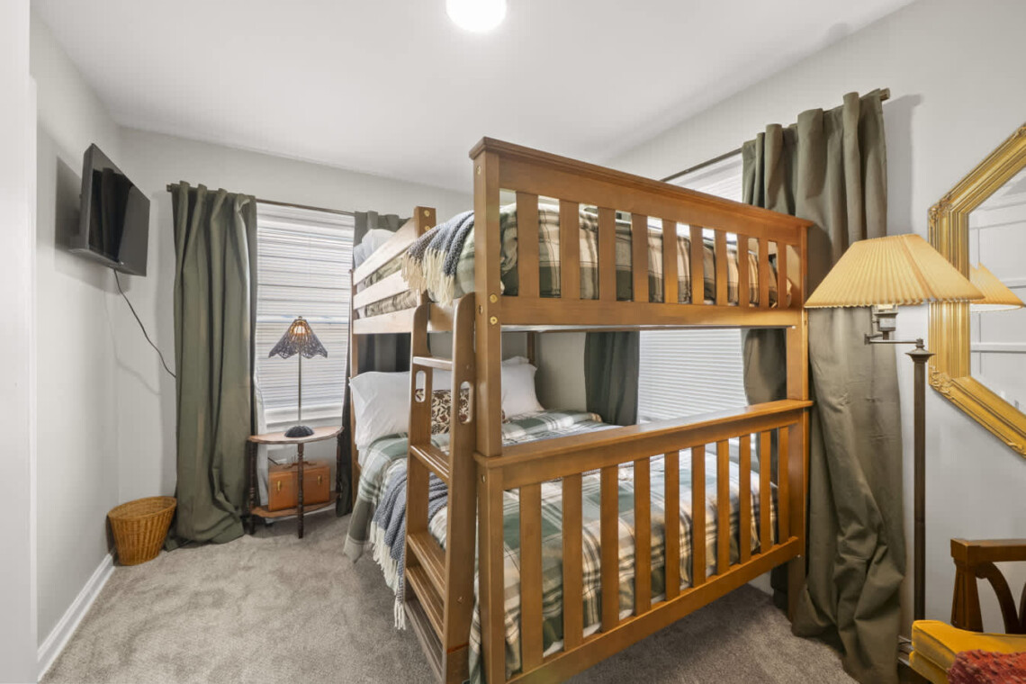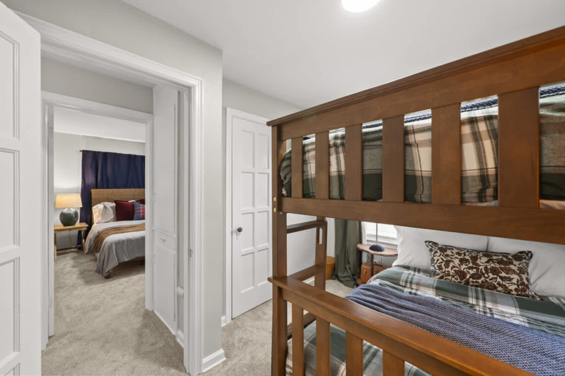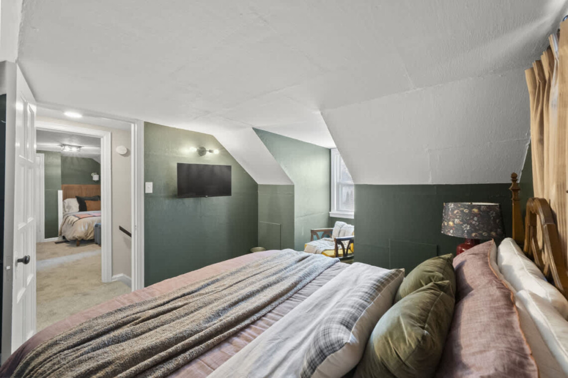 The second floor offers more private sleeping accommodations, ideal for families or couples traveling together.