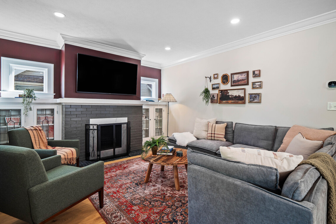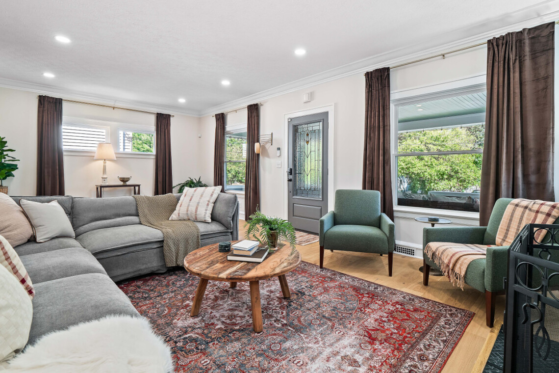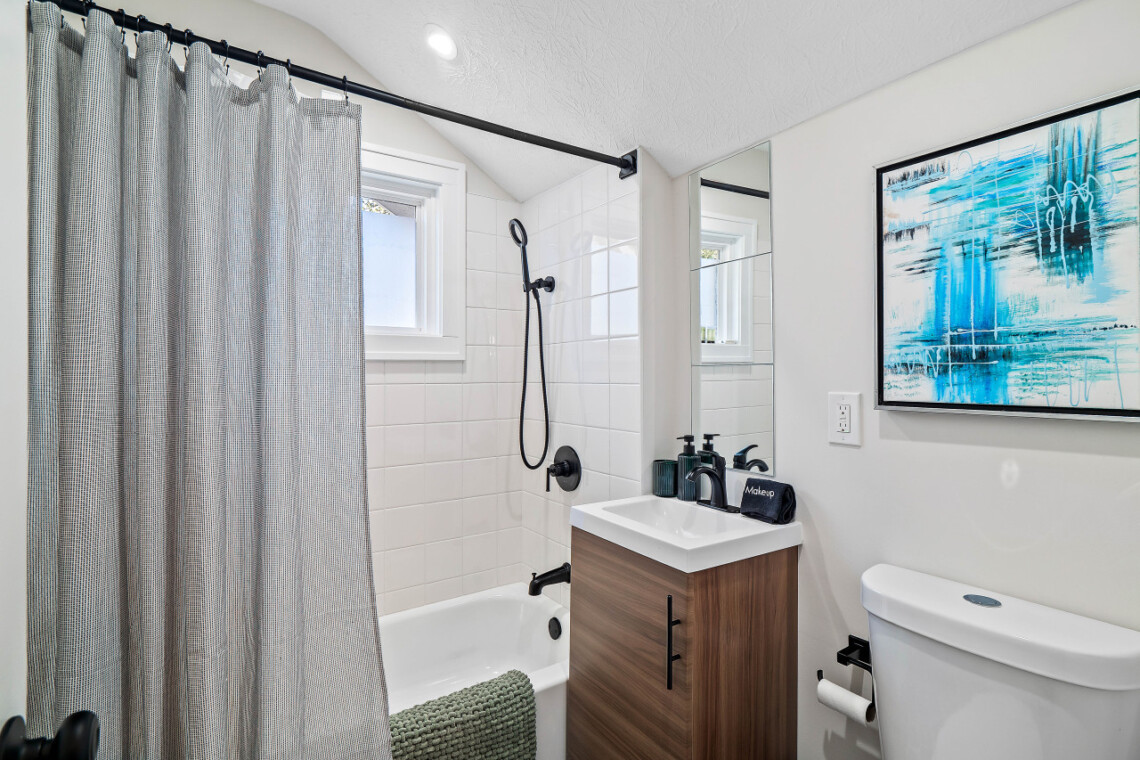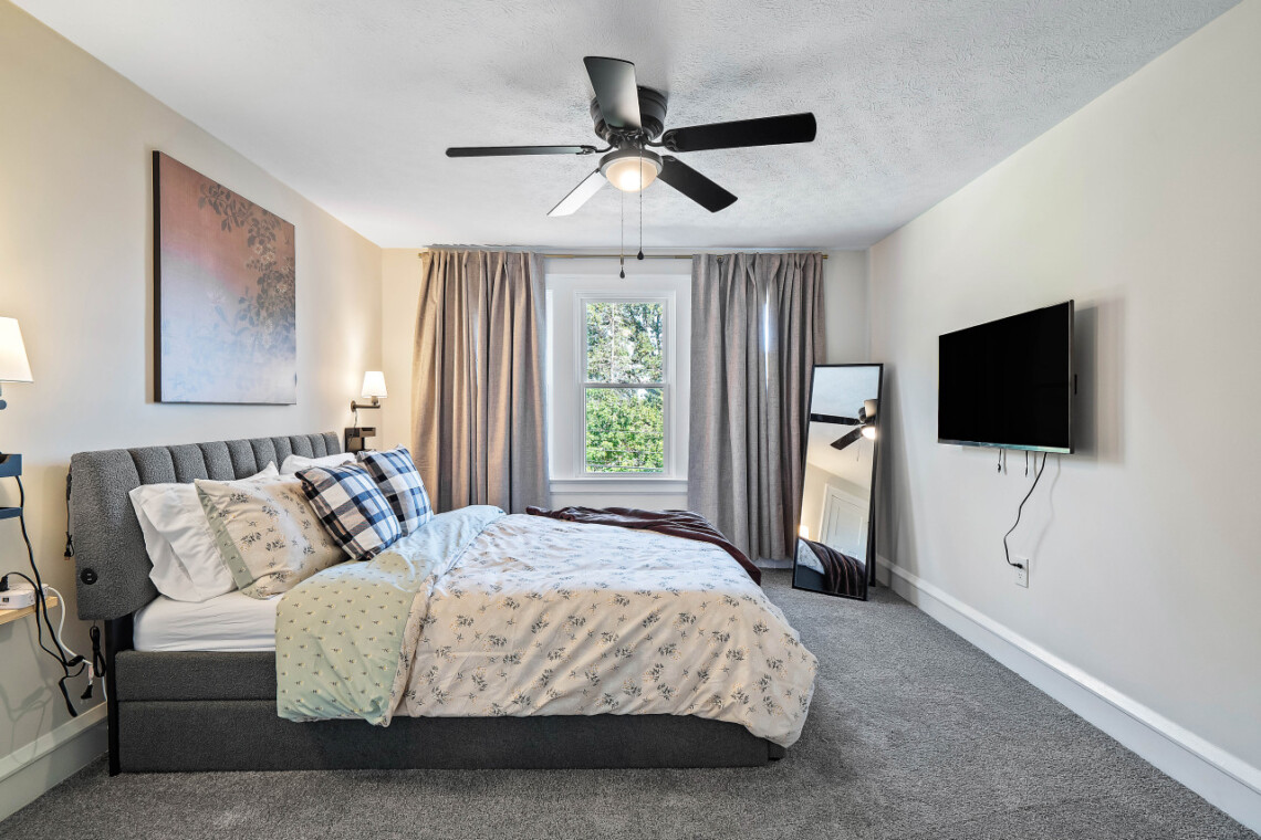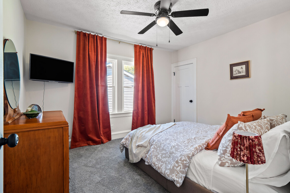 The layout is ideal for both comfort and privacy. The master bedroom with a king bed is located on the main floor and includes a private bathroom with a walk-in shower. Upstairs, you’ll find two bedrooms with queen beds and a fourth bedroom with two full beds, along with a second full bathroom featuring a tub/shower combo. There’s also a half bath on the main floor for added convenience.