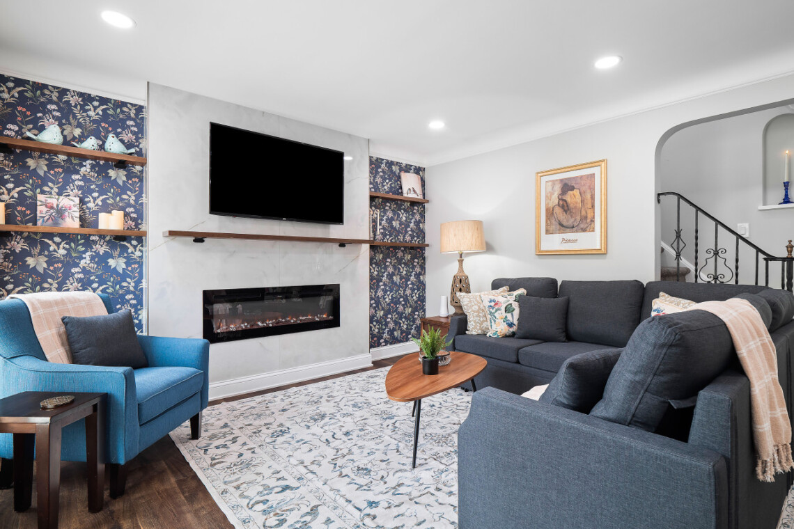 -Relax in the living room with an electric fireplace and sectional sofa that pulls out into a full bed.