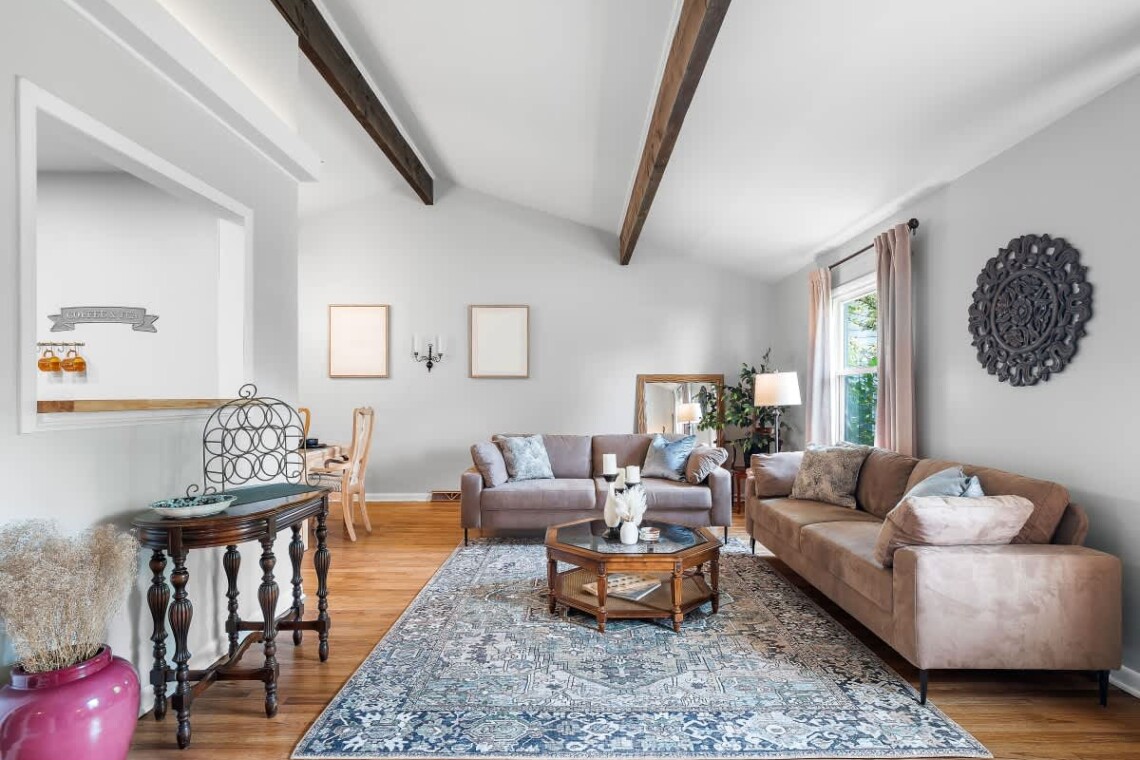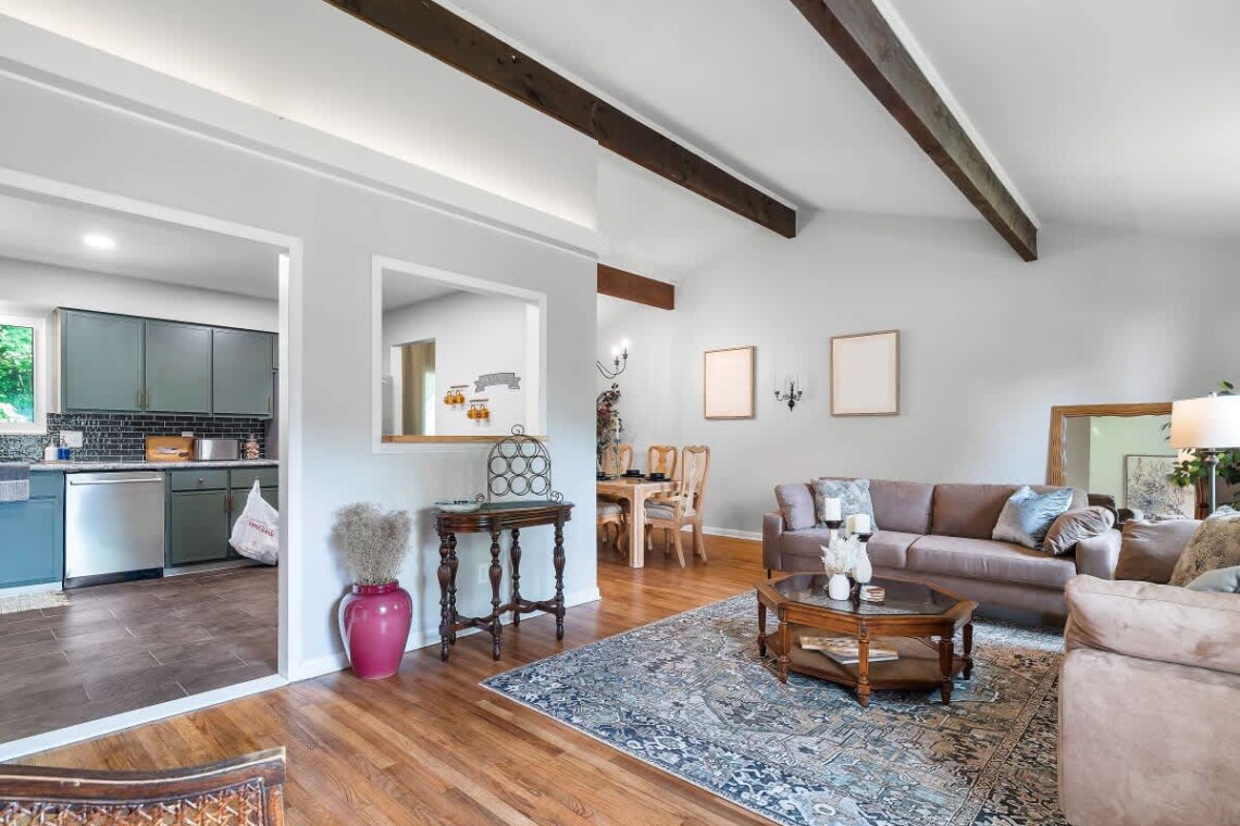 The main level includes a living room with beamed ceilings and a dining area with hardwood floors, leading out to the deck. The cozy family room on the lower level features exterior access and a built-in desk for workspace.