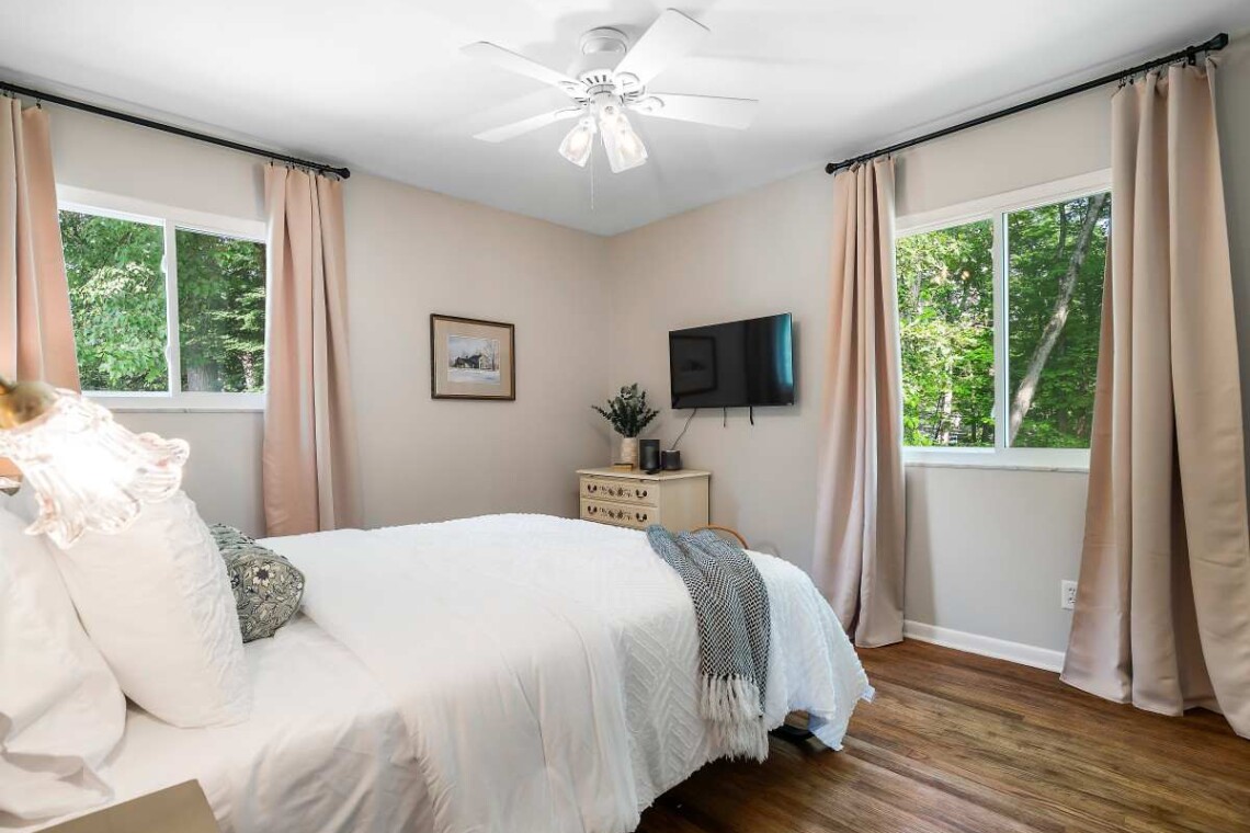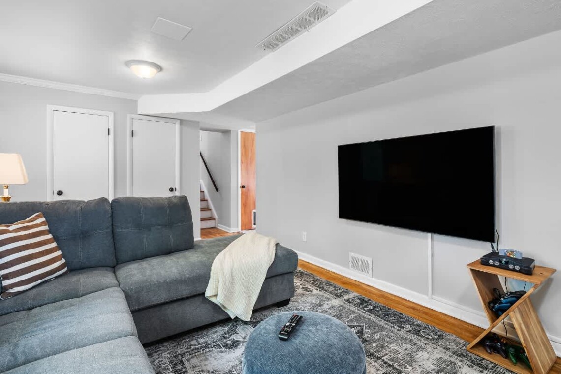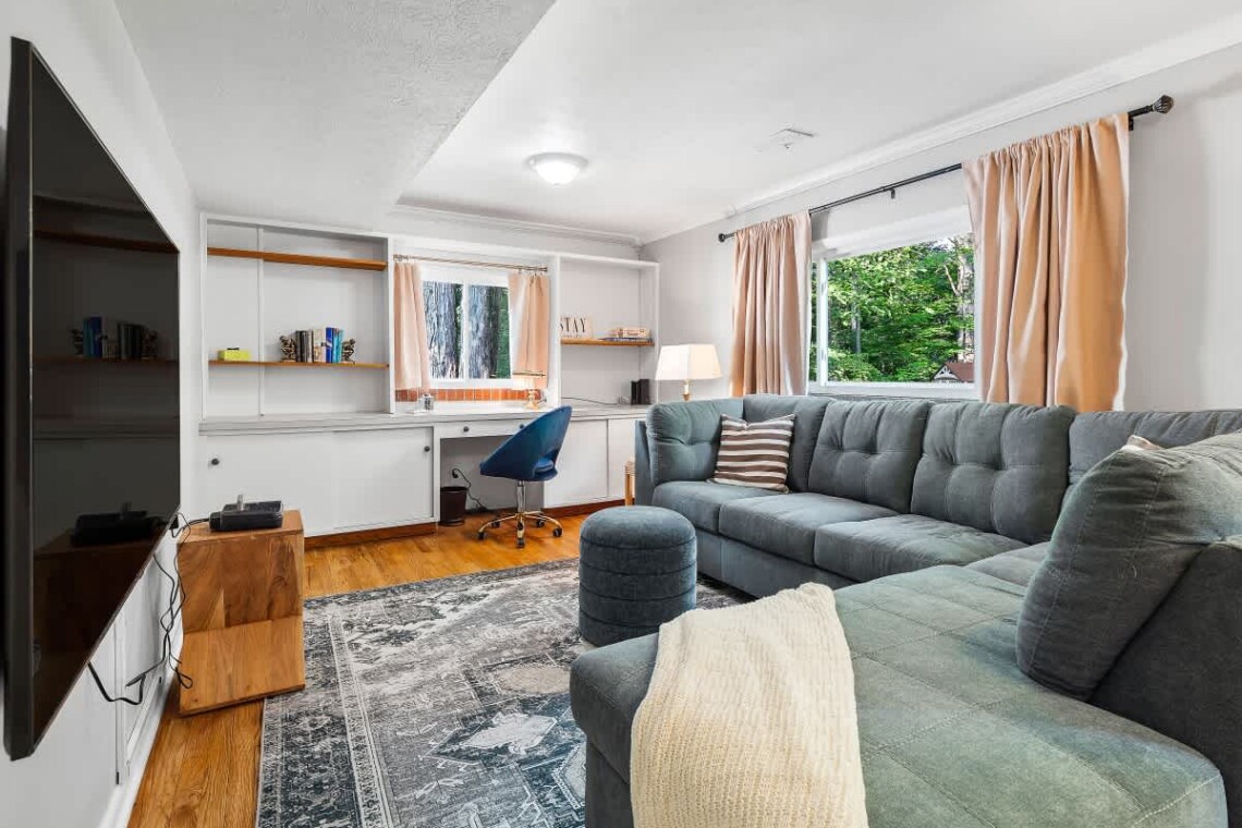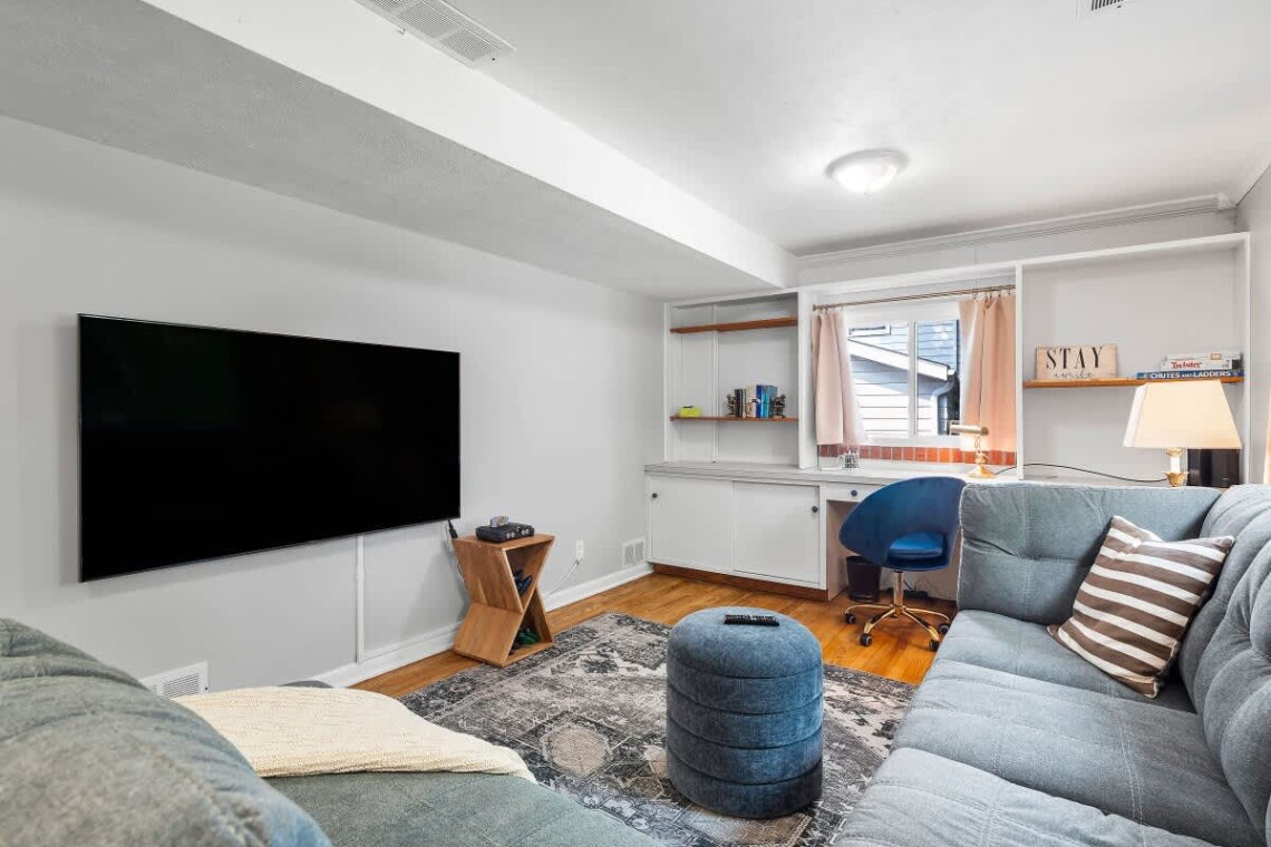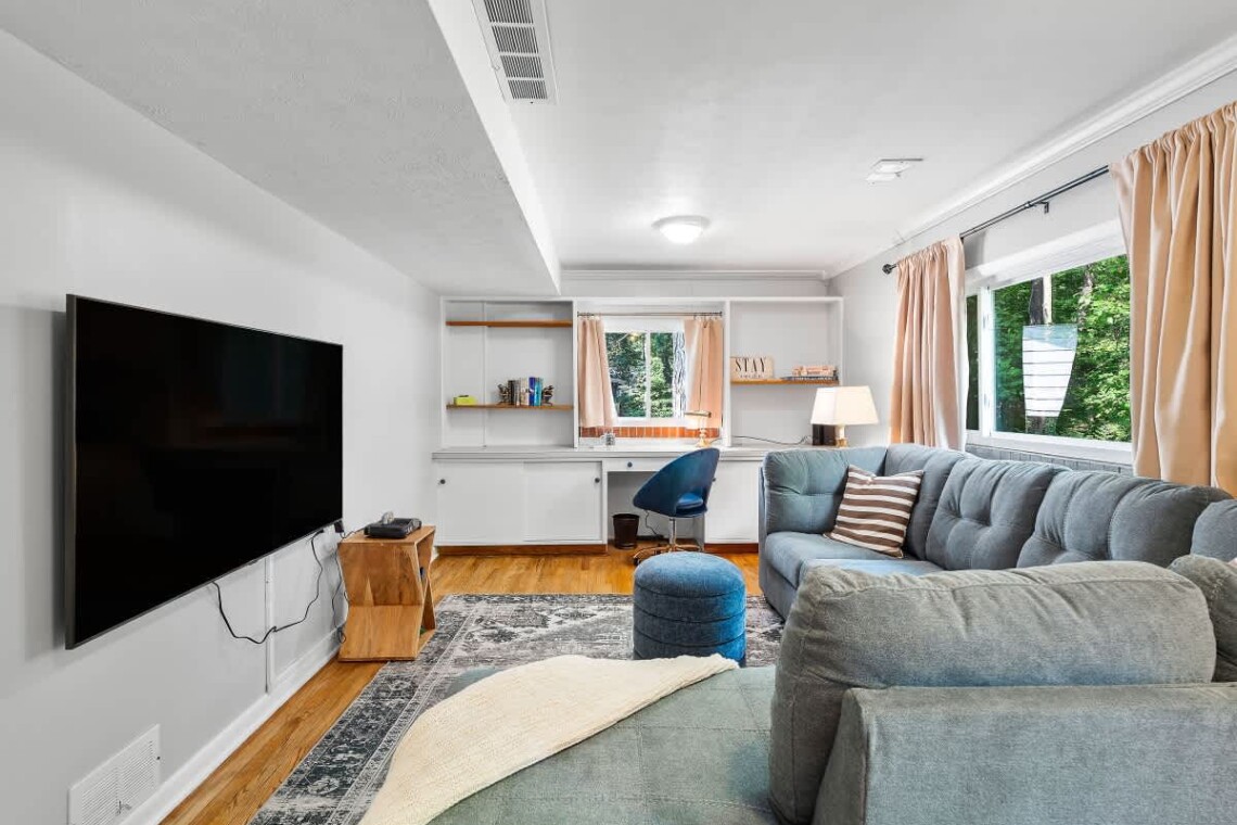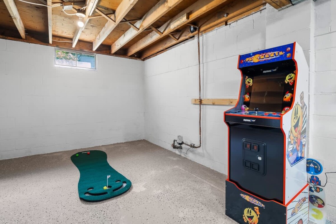 The basement is a hub of fun with an air hockey table, PacMan arcade game, and putting green. Enjoy board games, a game console, and a 55-inch HDTV with Roku for movie nights.