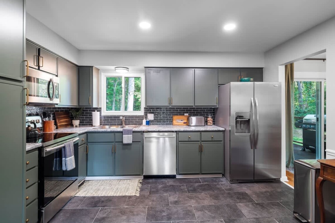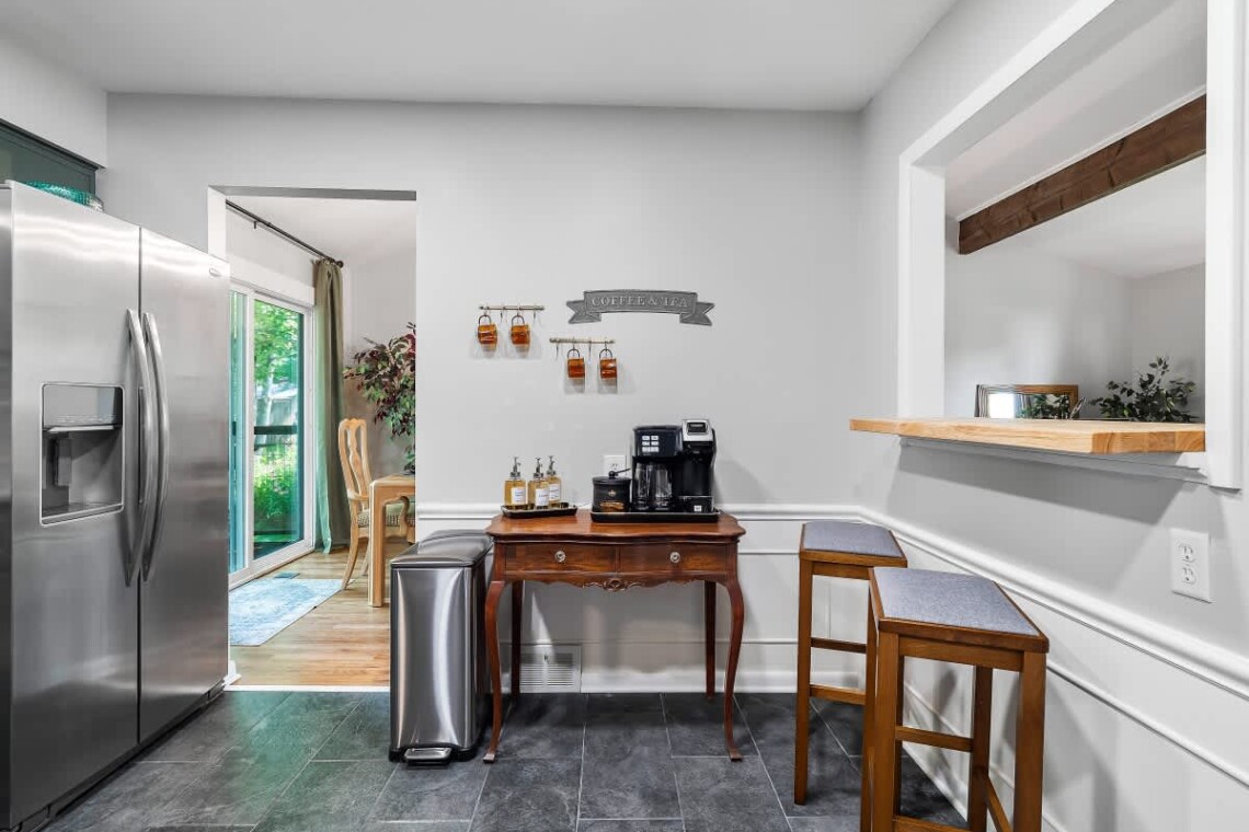The updated kitchen showcases stainless steel appliances, including a refrigerator, stove, oven, and dishwasher, along with both drip and Keurig coffee makers. Essentials such as pots, pans, and dishware are provided, and a dining table invites shared meals.