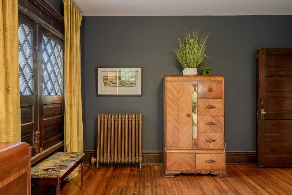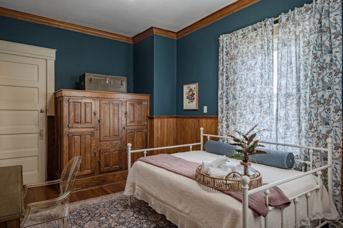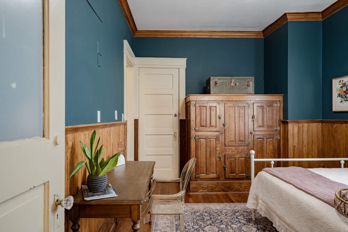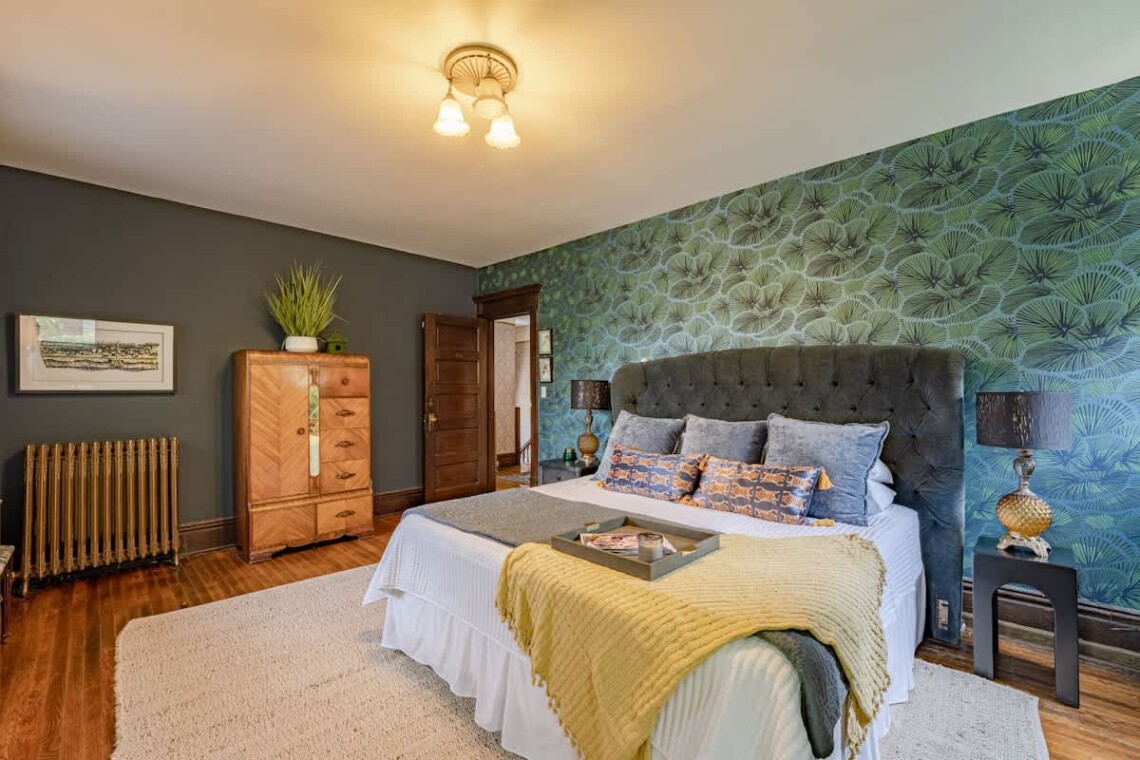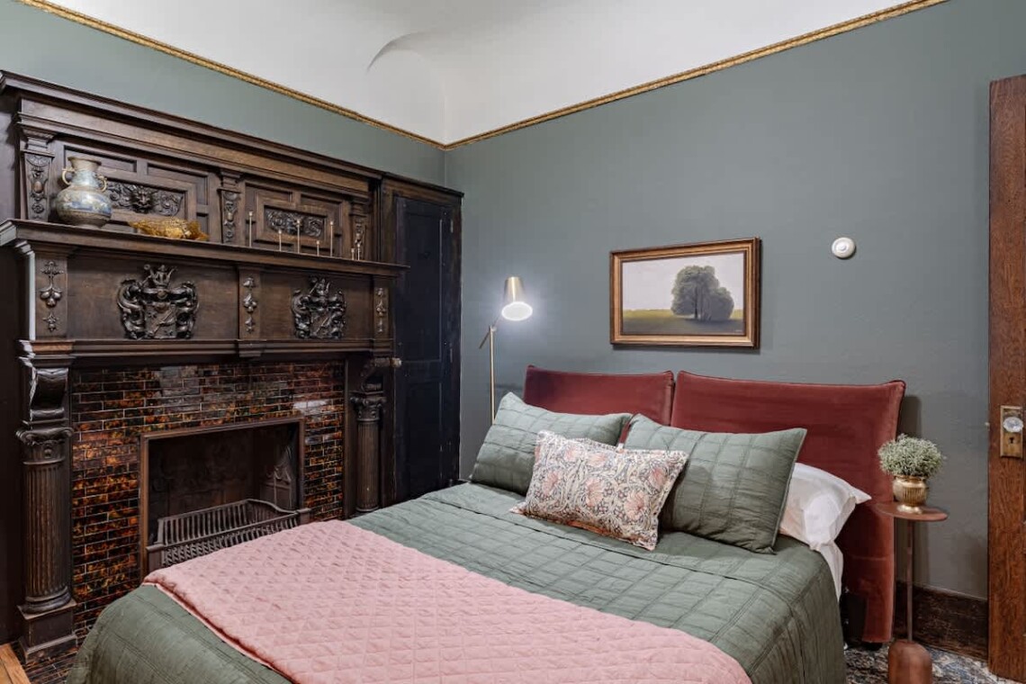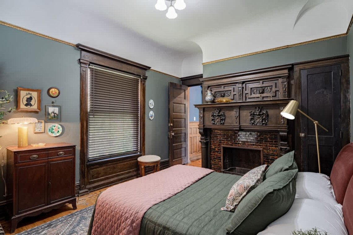 Upstairs, you’ll find two additional bedrooms and a full bathroom. The first bedroom is highlighted by a stunning king bed, a large armoire, an original marble fireplace, and a smart TV. The second bedroom offers a cozy queen bed and a charming nook, perfect for reading or enjoying a morning coffee..