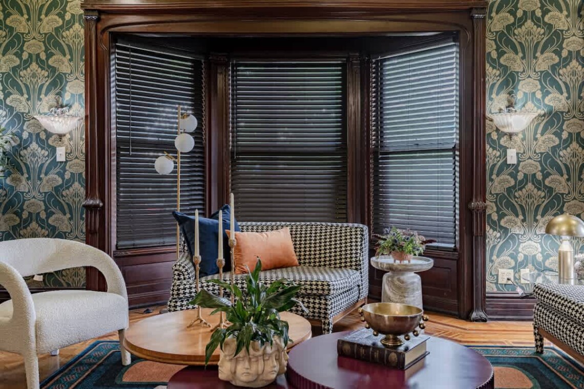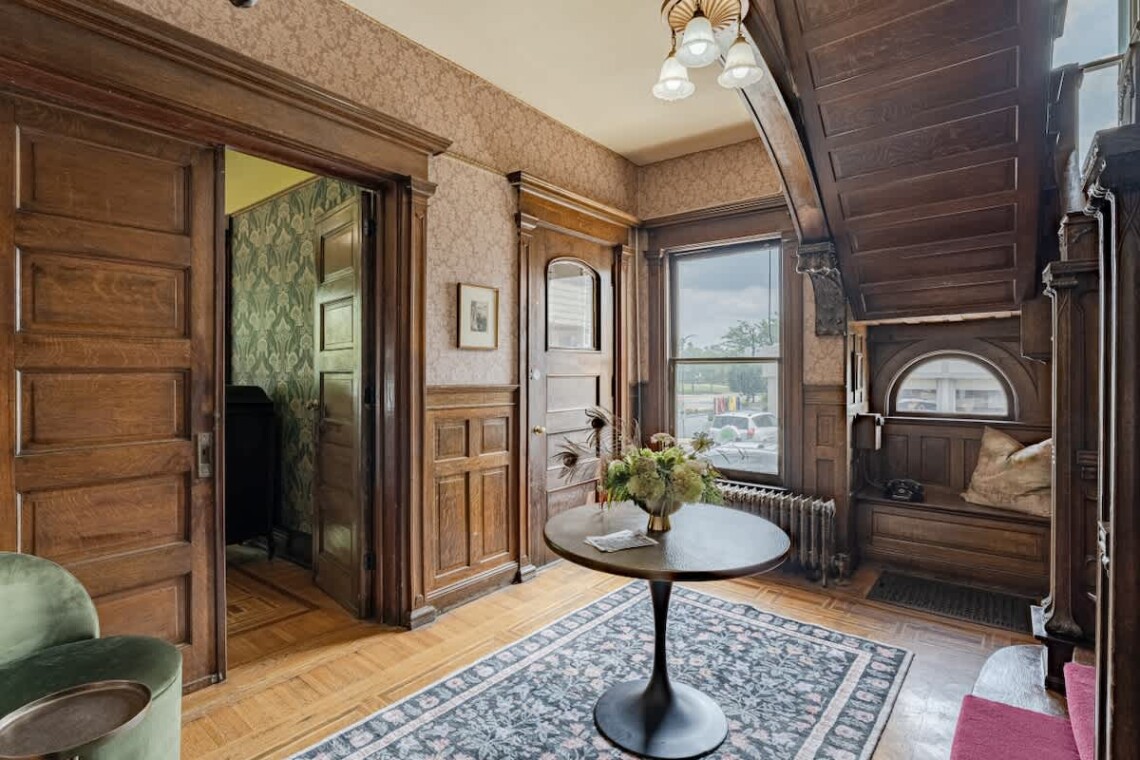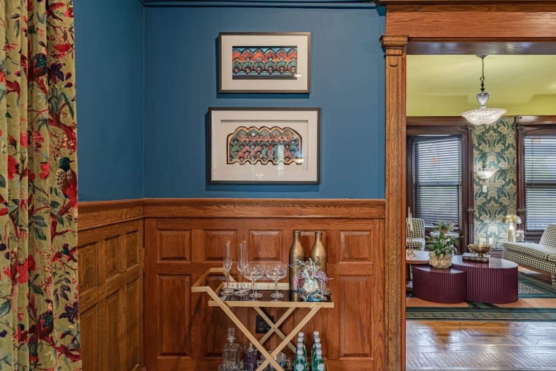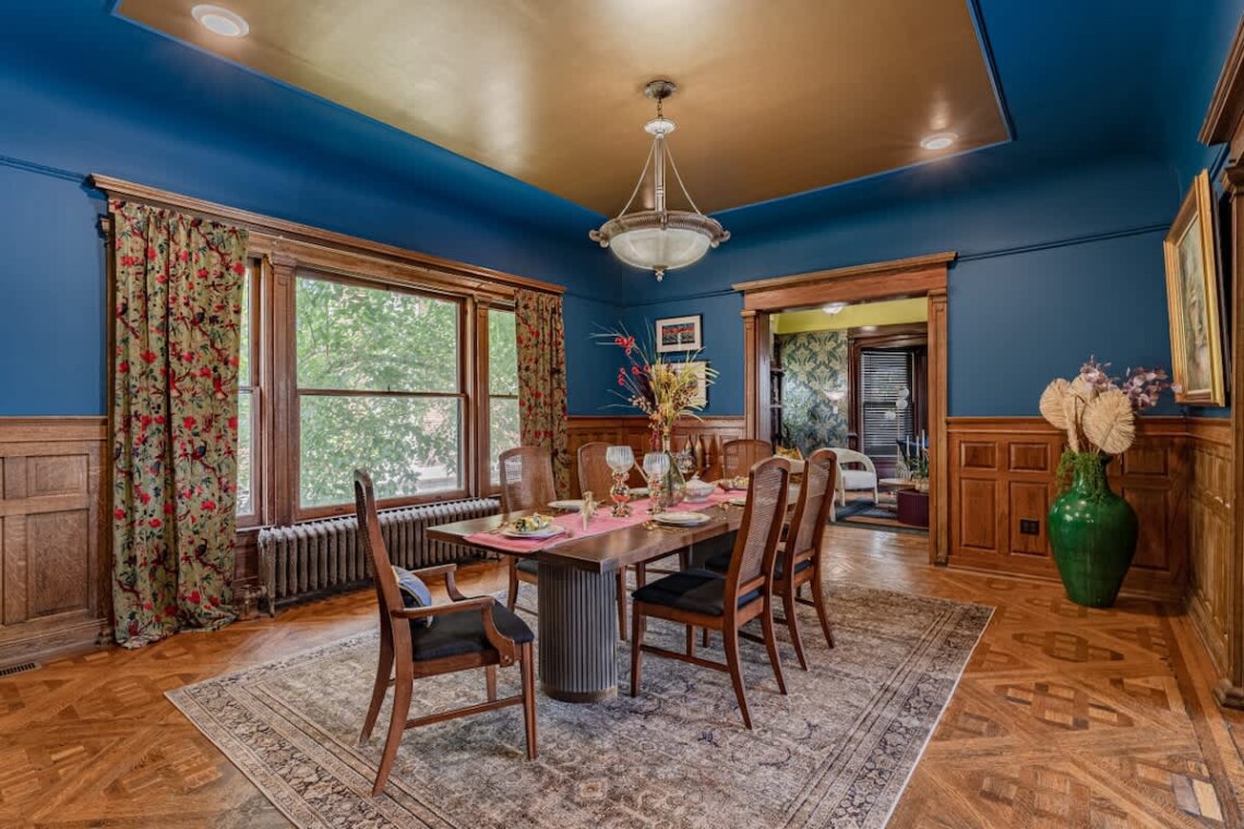 As you enter, the grand staircase and original woodwork greet you in the foyer, setting the tone for the entire home. The expansive living room boasts an original marble fireplace, soaring ceilings, and an abundance of natural light, creating a warm and inviting atmosphere. Through the original pocket doors, you’ll find the elegant dining room, complete with built-in cabinetry, a large dining table, and a bar cart—ideal for hosting memorable gatherings. The kitchen is fully equipped, providing everything you need to effortlessly prepare homemade meals.
