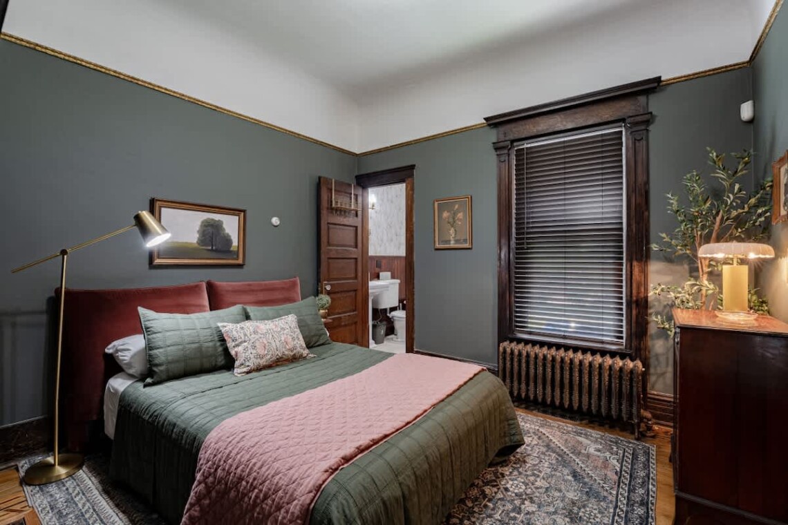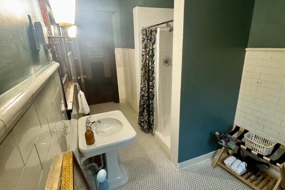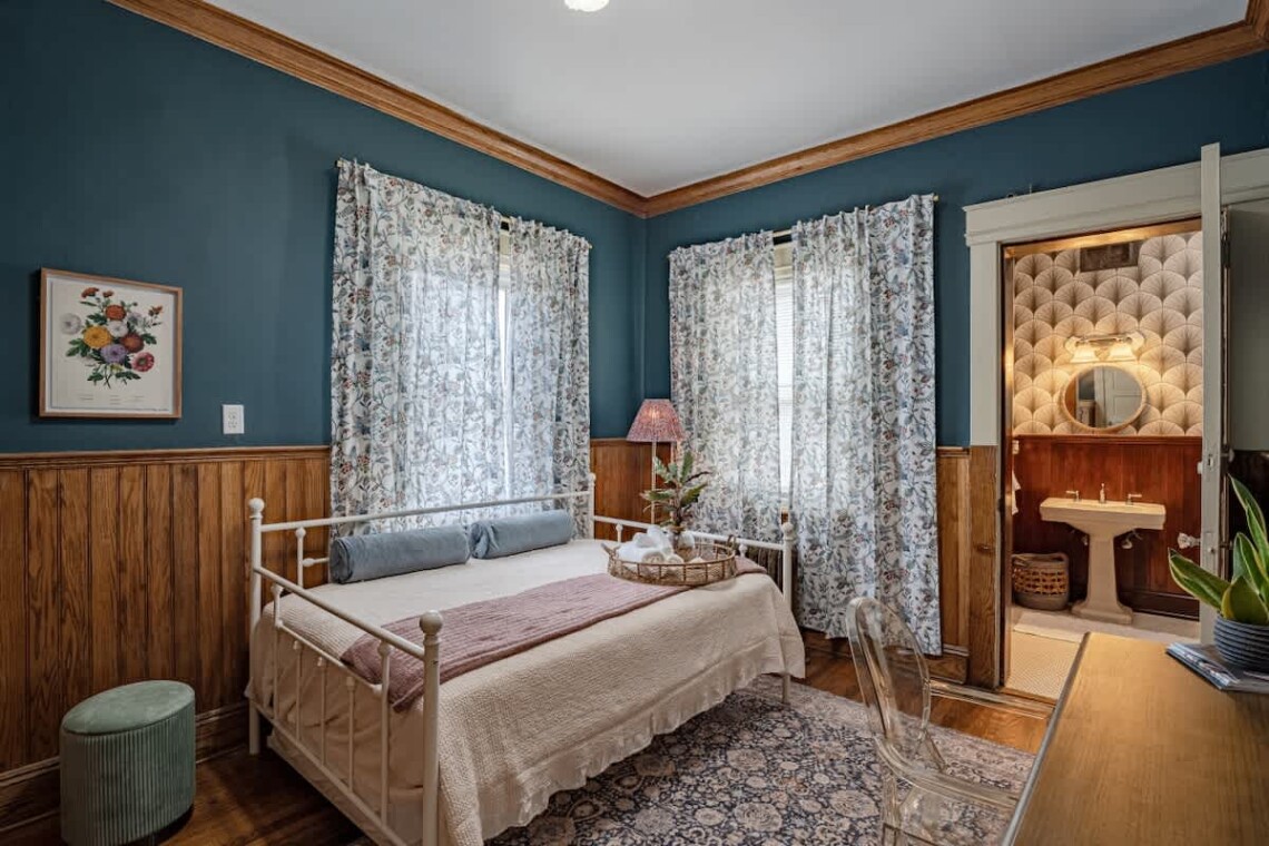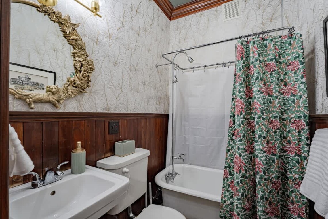 The main floor also offers two bedrooms, each with its own ensuite bathroom featuring an original clawfoot tub. The first bedroom includes a full trundle bed with a twin underneath, and a desk, perfect for those who need a quiet workspace. The second bedroom features a queen bed, another original marble fireplace, and ample closet space.