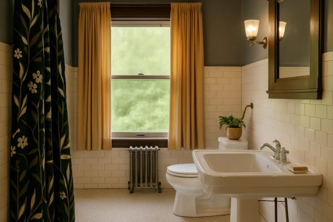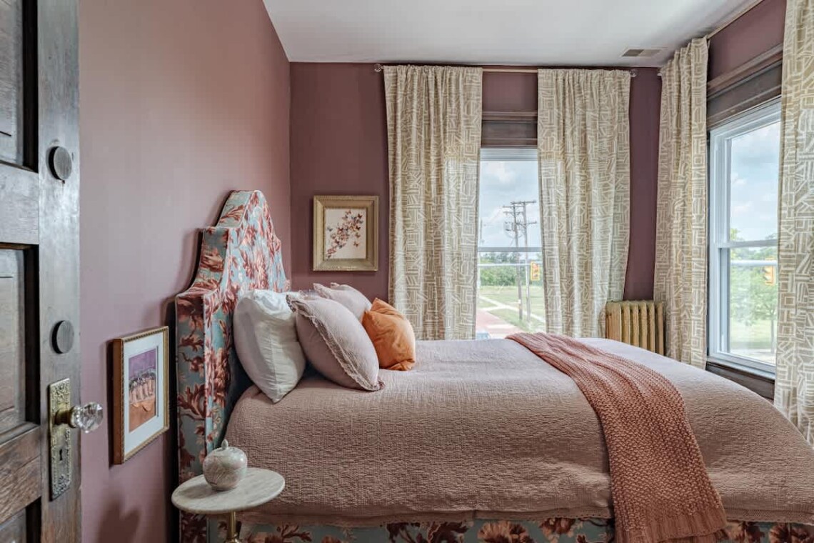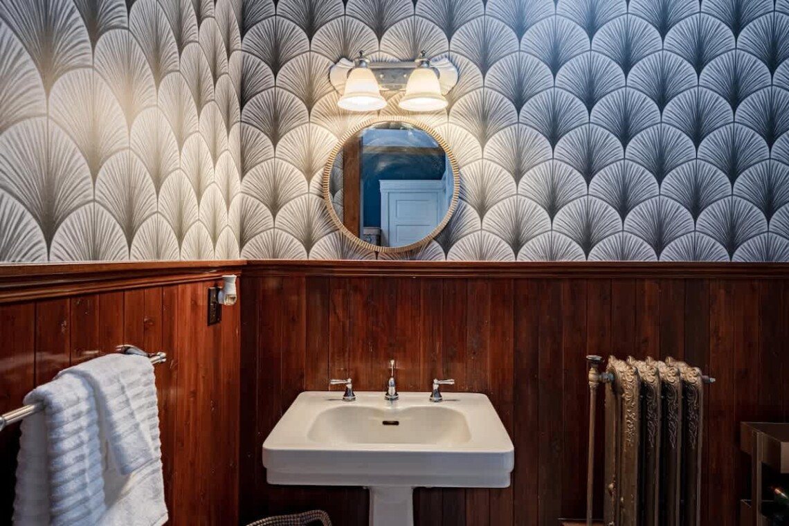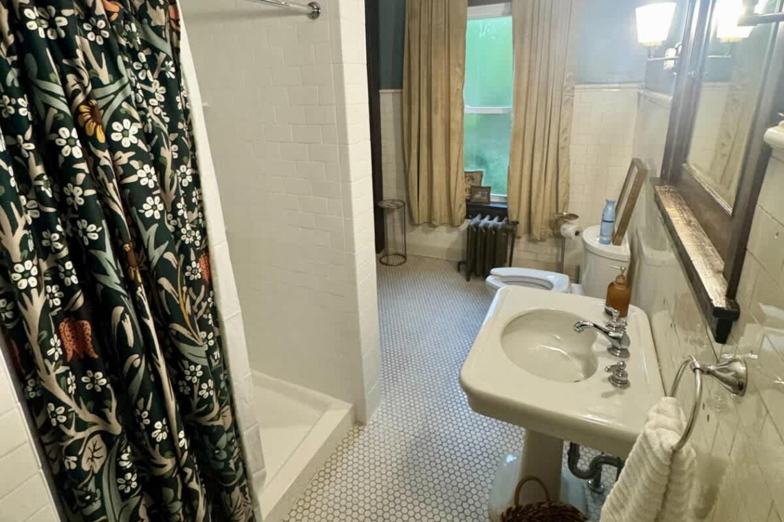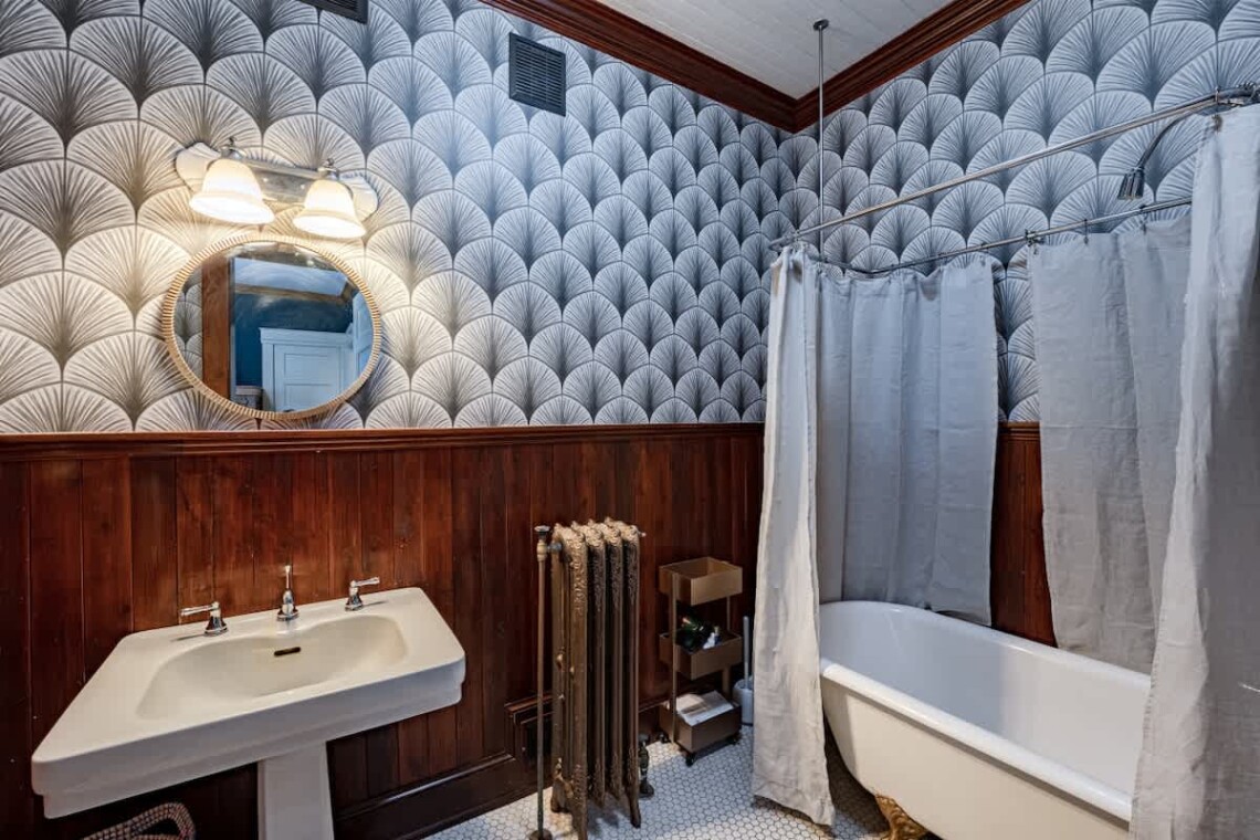 The main floor also offers two bedrooms, each with its own ensuite bathroom featuring an original clawfoot tub. The first bedroom includes a full trundle bed with a twin underneath, and a desk, perfect for those who need a quiet workspace. The second bedroom features a queen bed, another original marble fireplace, and ample closet space.