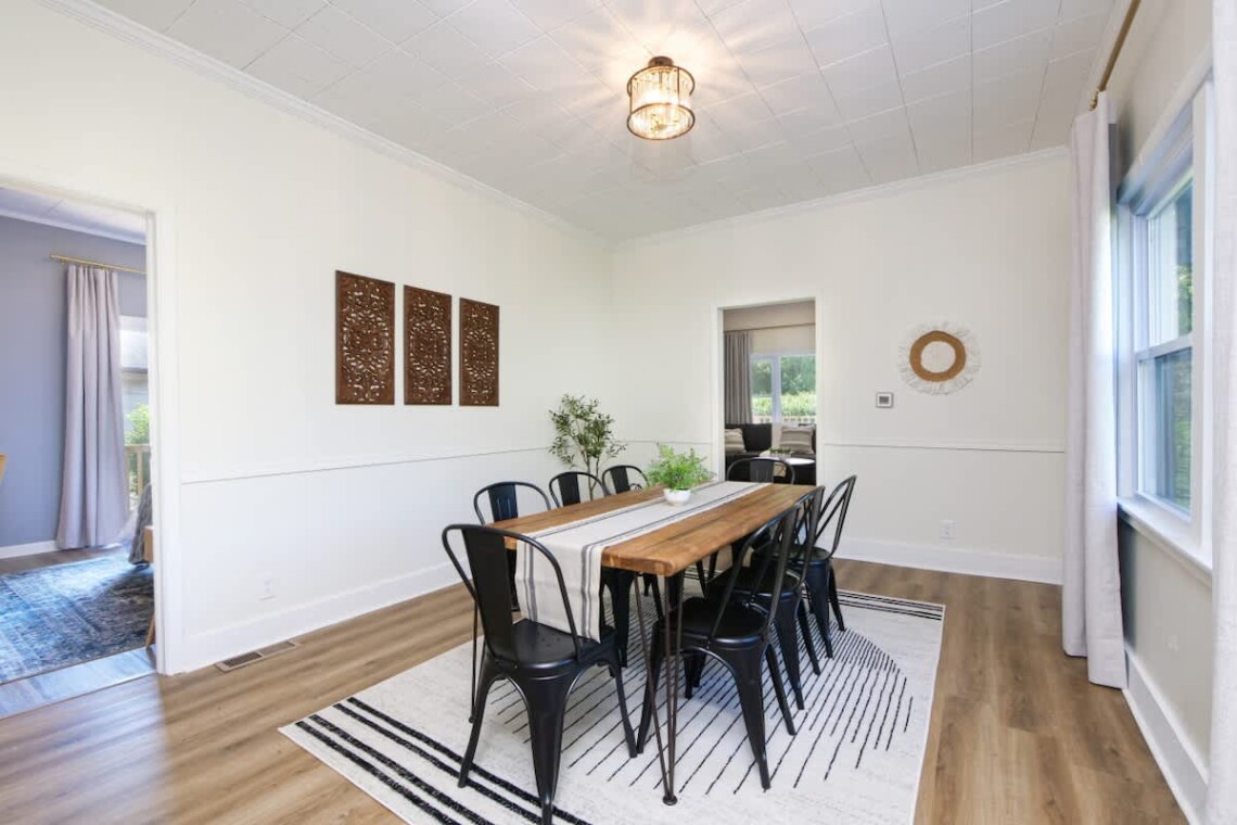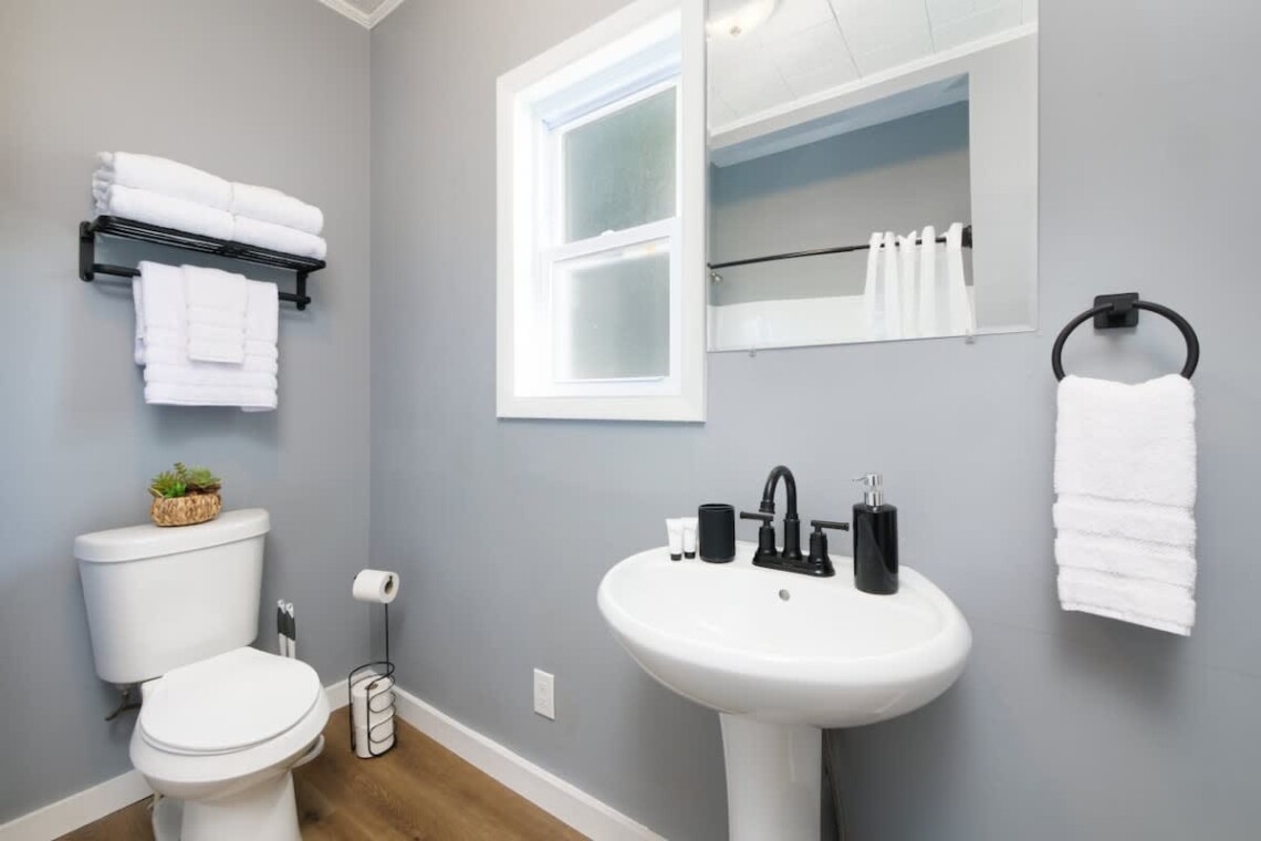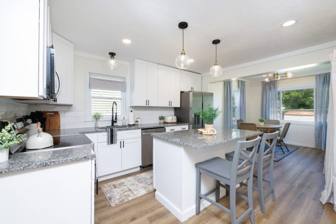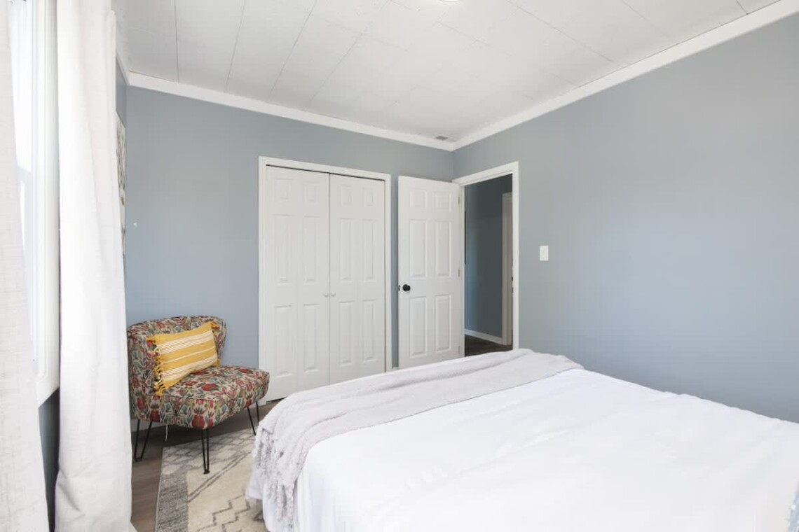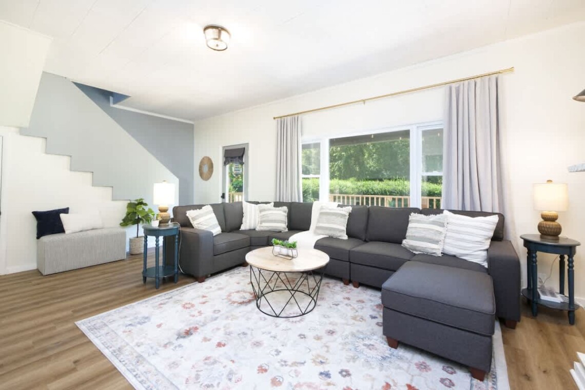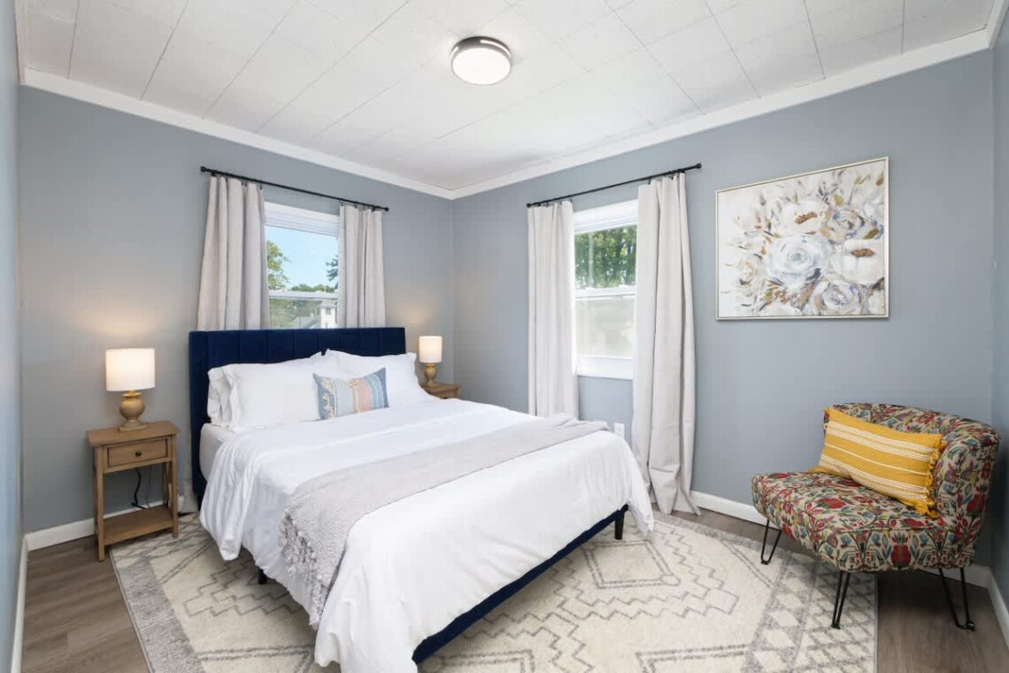 With 5 bedrooms and 7 beds, the home comfortably hosts up to 10 guests. Each bedroom is prepared with bed linens, extra pillows and blankets, and room-darkening shades for restful nights. Closets and dressers provide plenty of storage for longer stays. Three full bathrooms are stocked with towels, shampoo, conditioner, body soap, and other essentials.