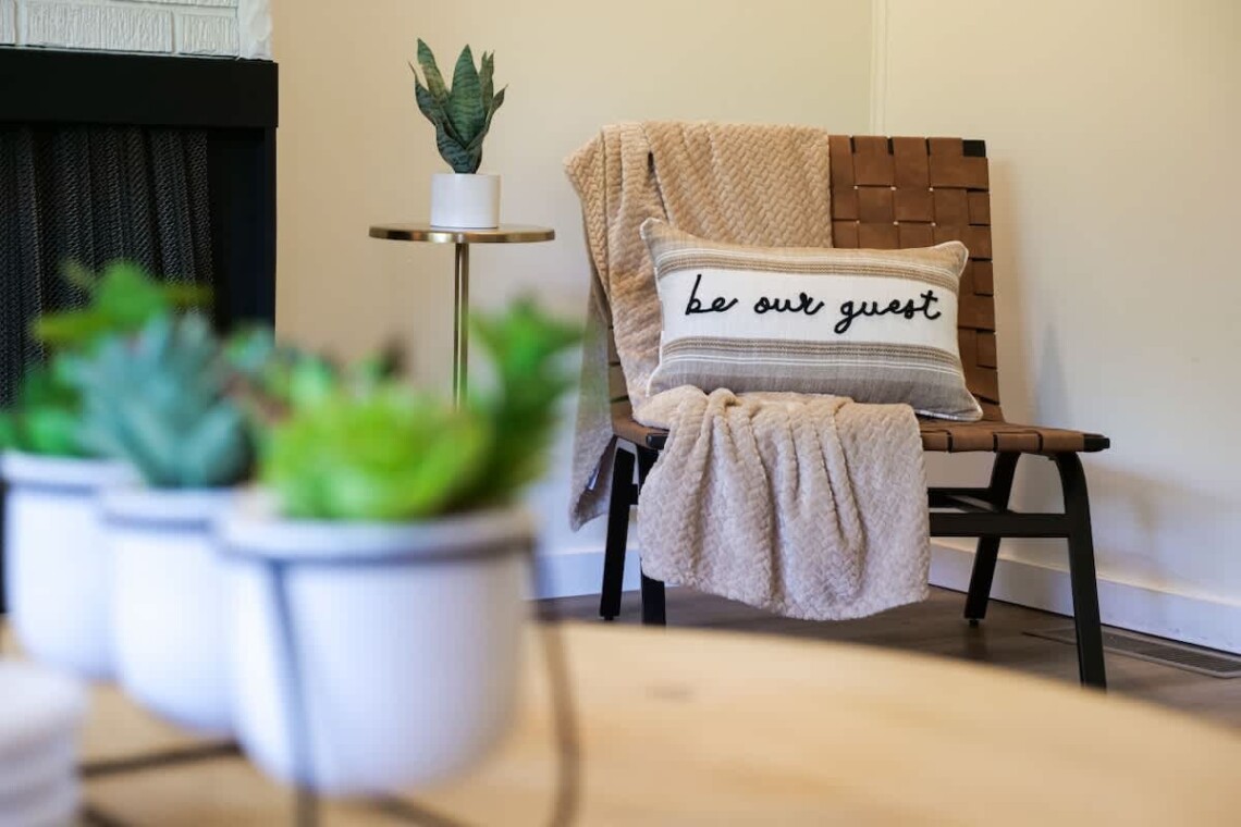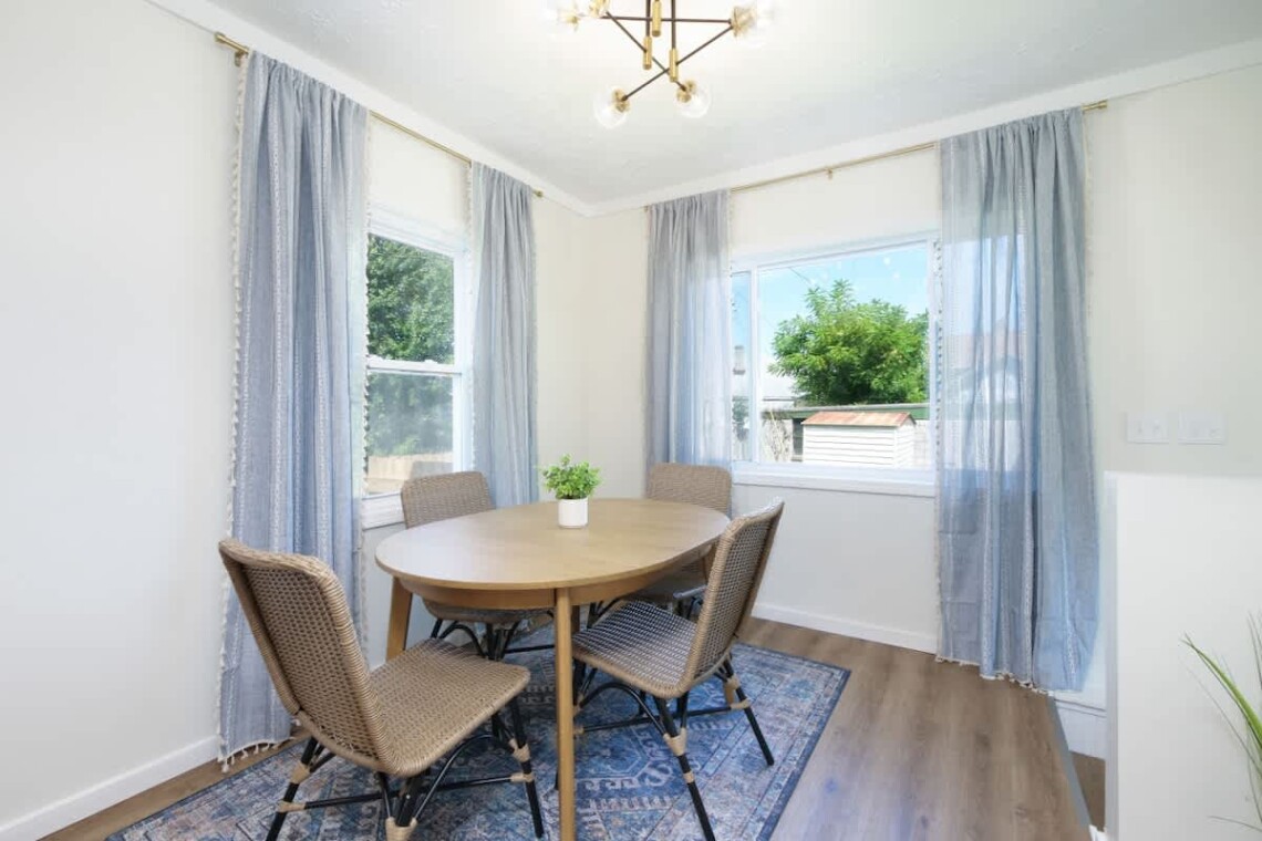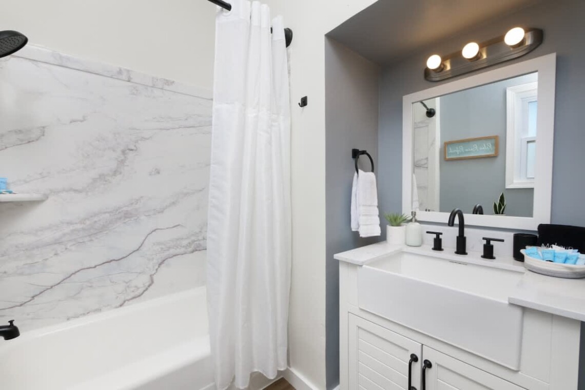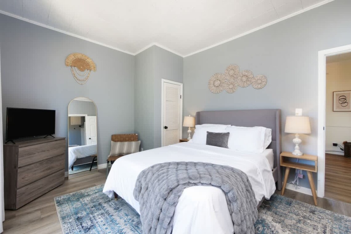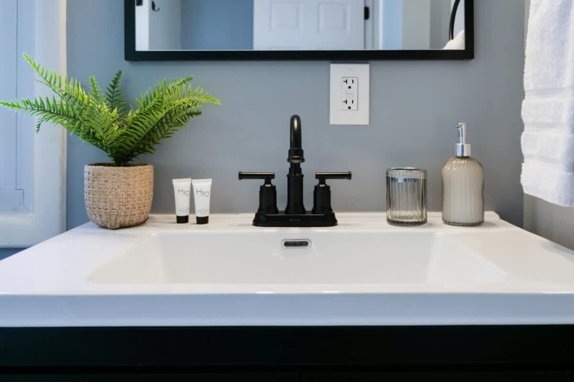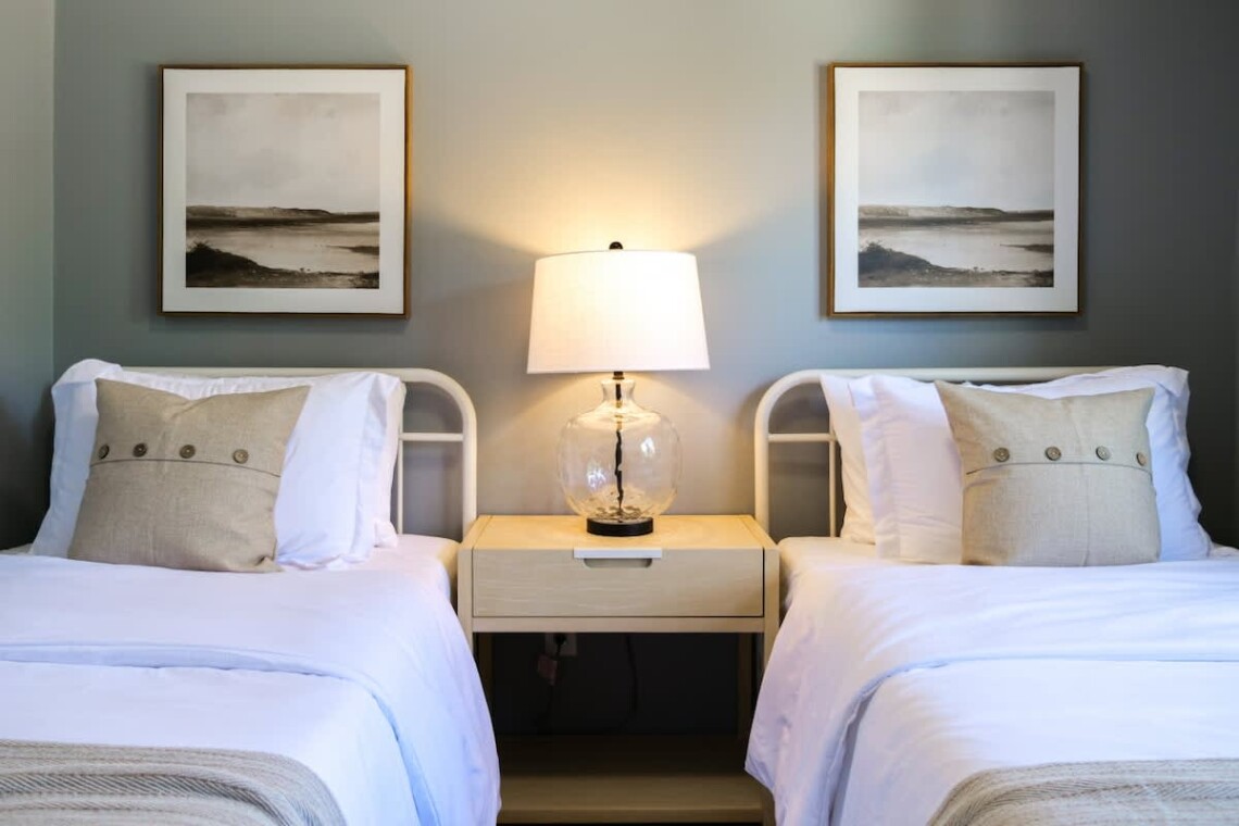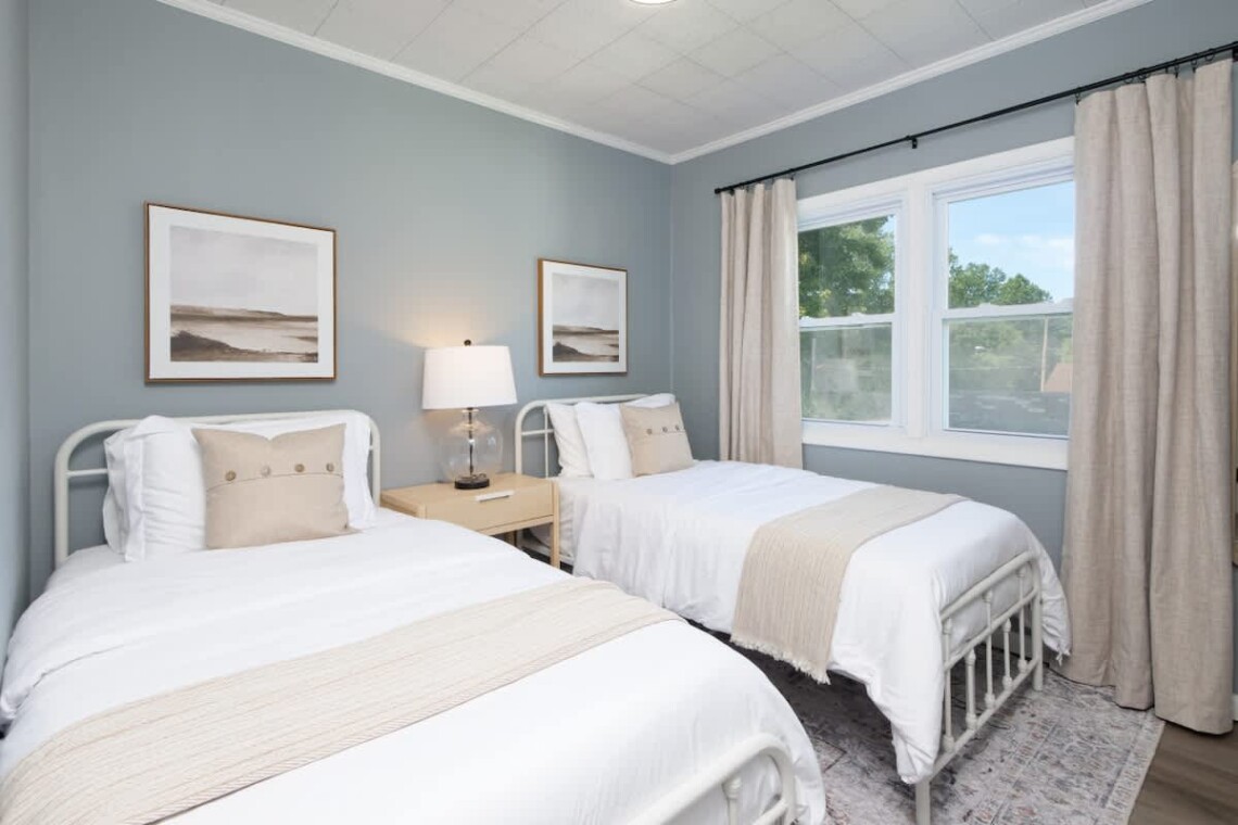 With 5 bedrooms and 7 beds, the home comfortably hosts up to 10 guests. Each bedroom is prepared with bed linens, extra pillows and blankets, and room-darkening shades for restful nights. Closets and dressers provide plenty of storage for longer stays. Three full bathrooms are stocked with towels, shampoo, conditioner, body soap, and other essentials.