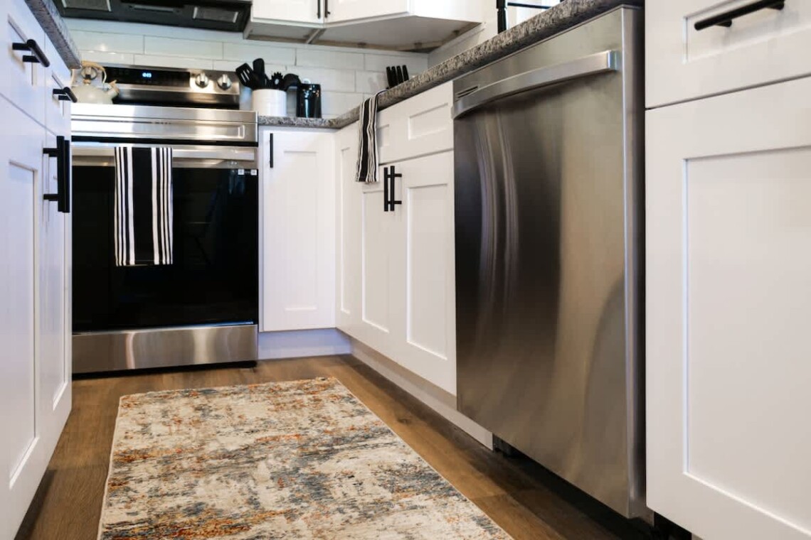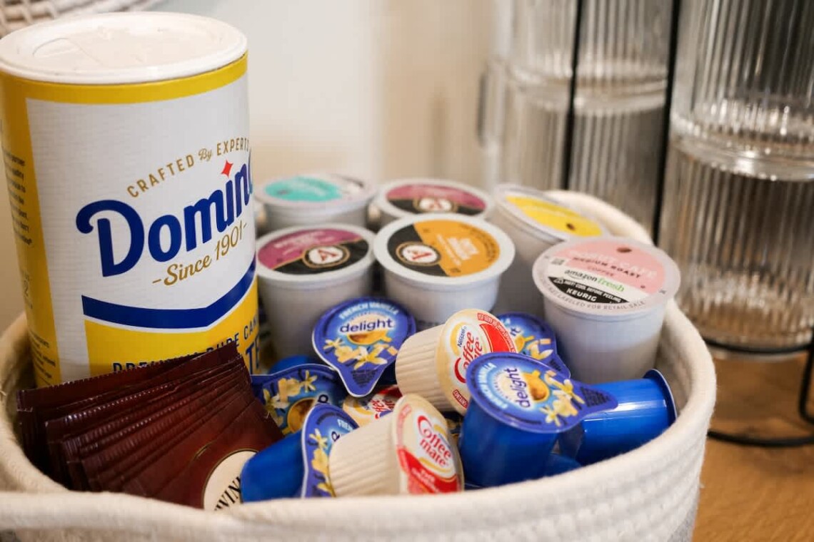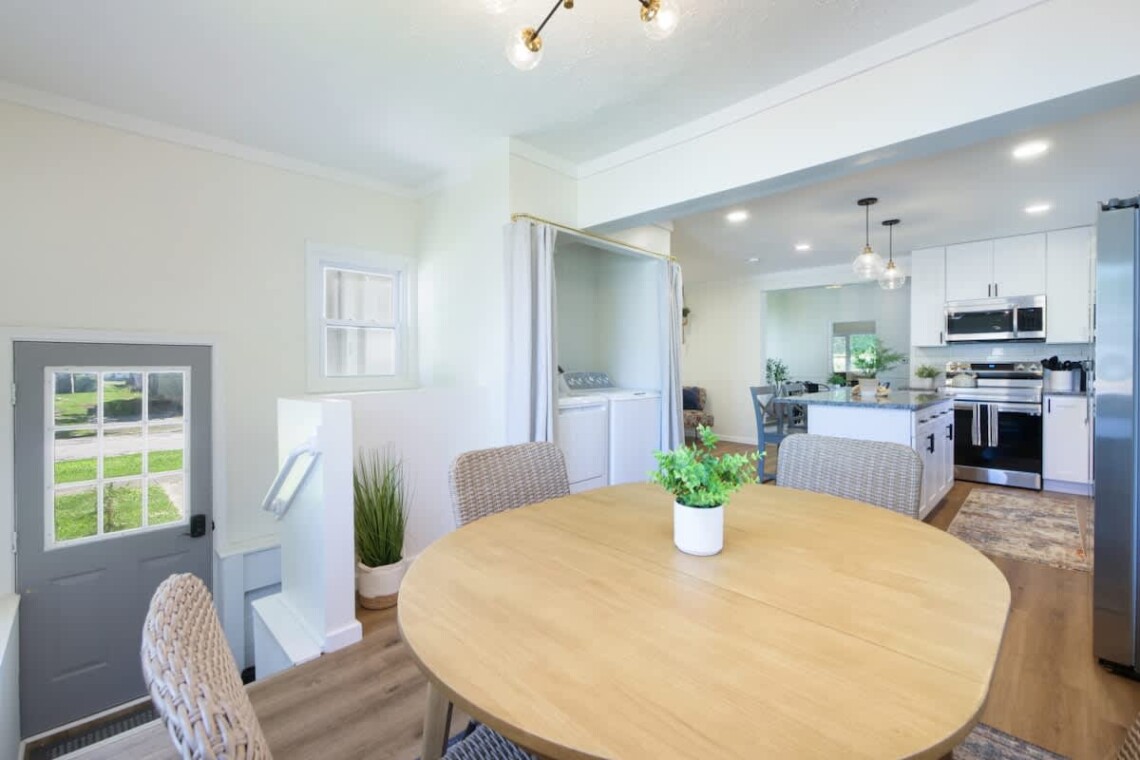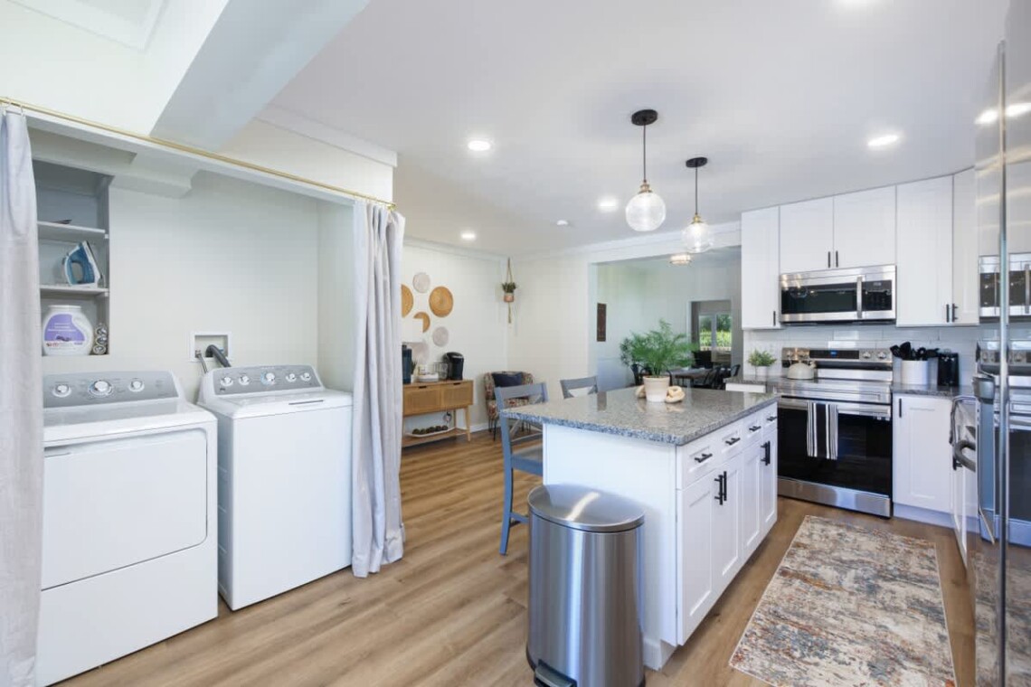 A fully equipped kitchen invites you to prepare meals with ease. Cook with the Whirlpool stainless steel electric stove, oven, and microwave, and keep groceries fresh in the refrigerator and freezer. The dishwasher makes cleanup simple, while coffee lovers can choose between a drip coffee maker or Keurig machine. Wine glasses, a toaster, blender, and baking sheet round out the space, and the dining table brings everyone together.