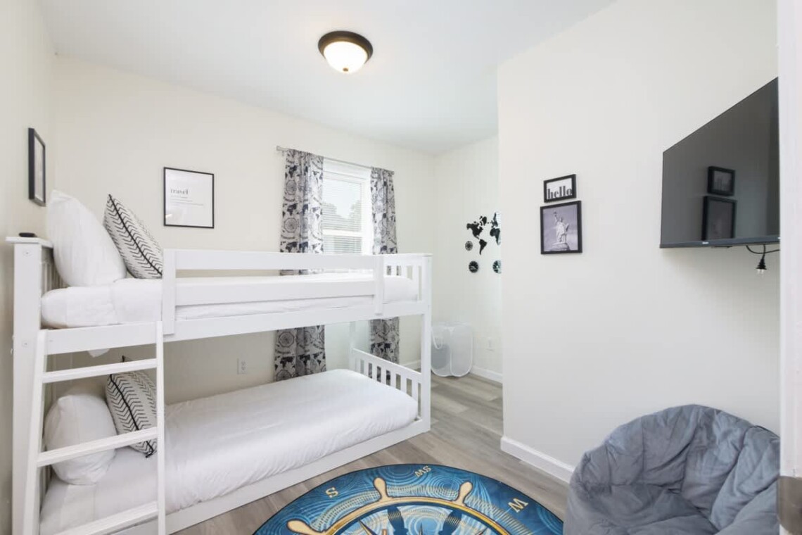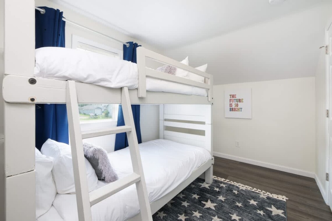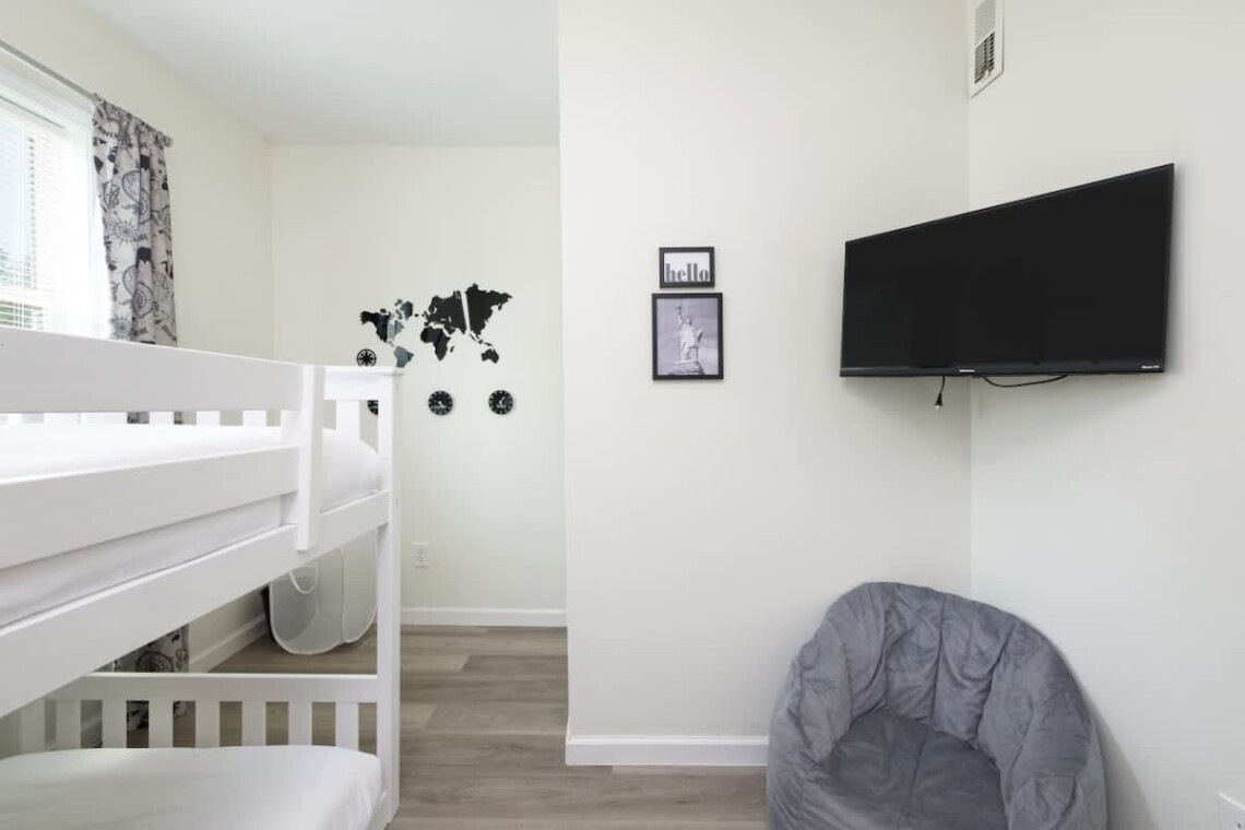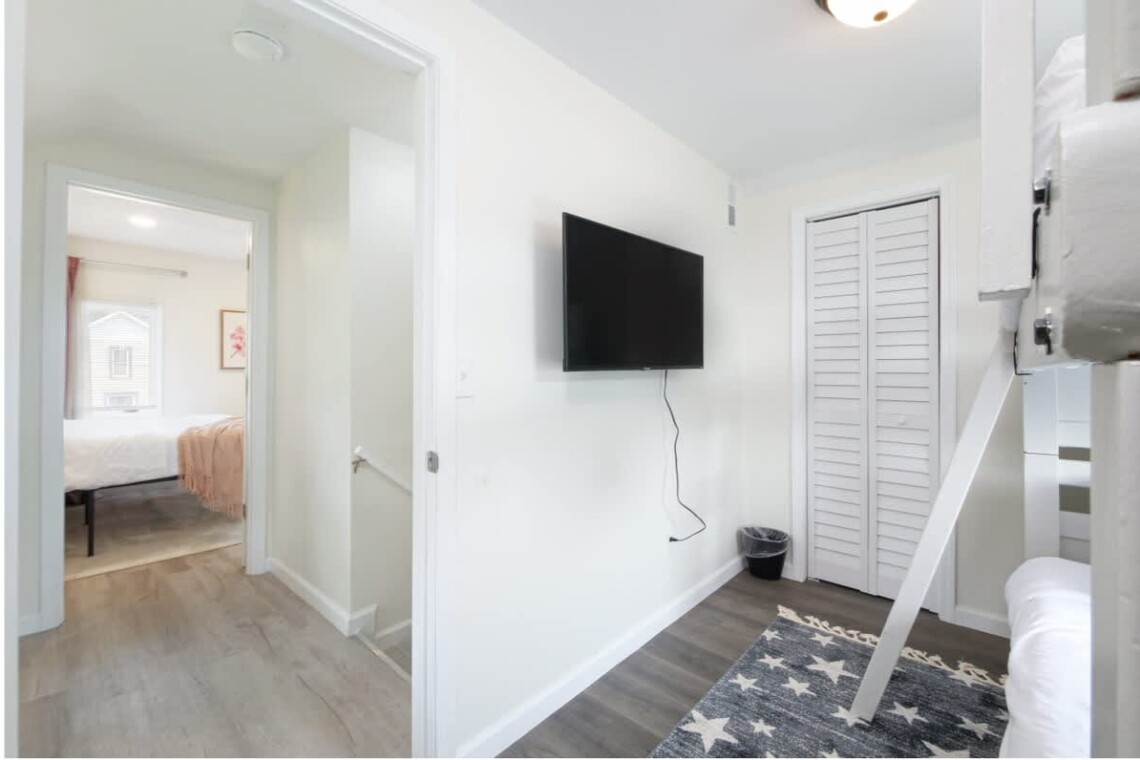 This home offers four bedrooms spread across two levels, accommodating up to 8 guests. On the first floor, one bedroom features a queen bed, while another has twin bunk beds. Upstairs, you will find two more bedrooms: one with a queen bed and the other with twin bunk beds. Each bedroom is equipped with its own TV for added convenience. A fully updated bathroom with a tub and shower combination is located on the main floor, stocked with essentials including towels, soap, shampoo, and a hair dryer.