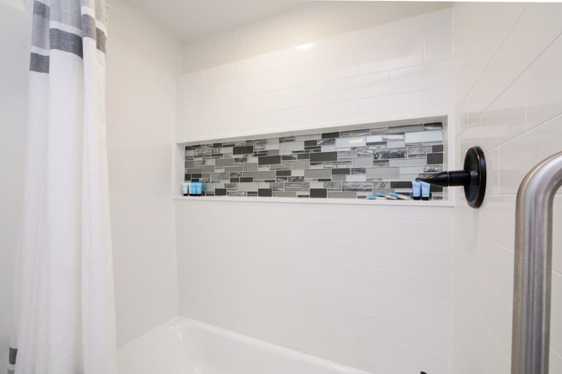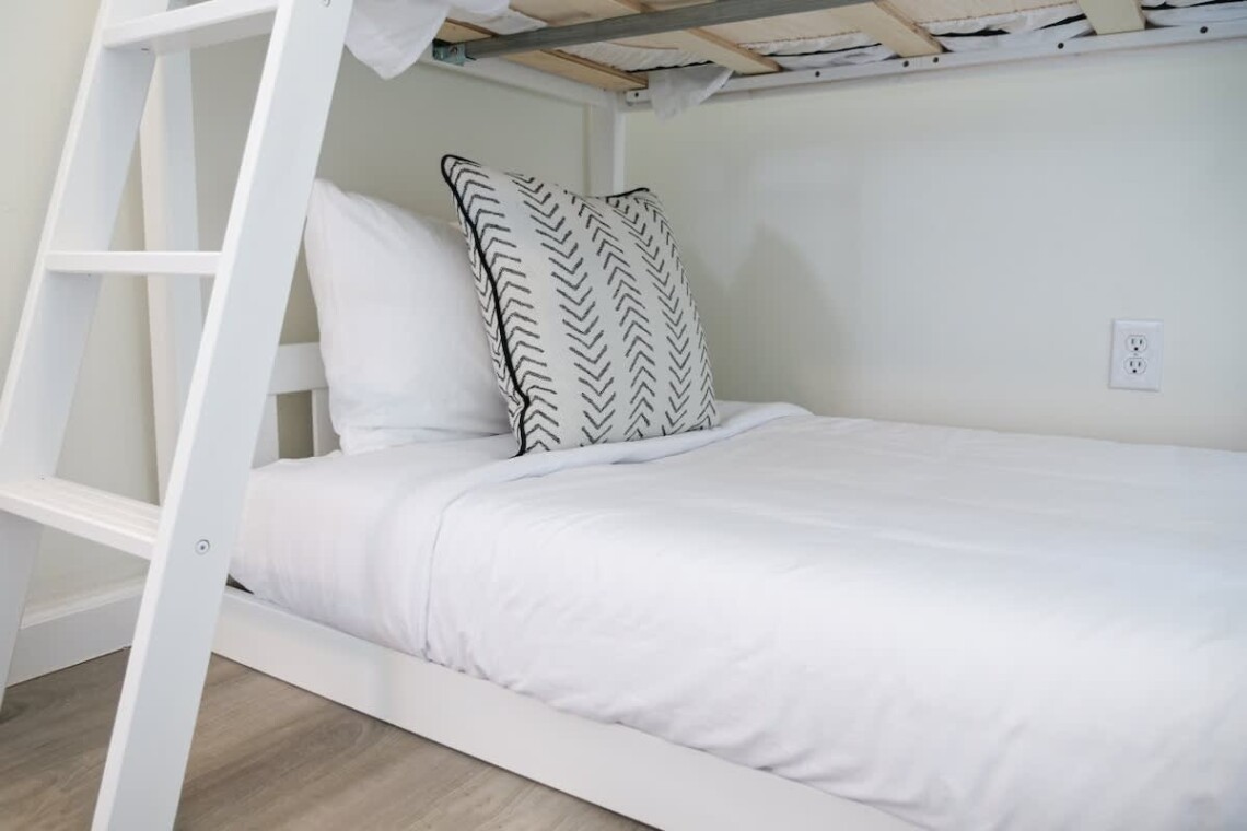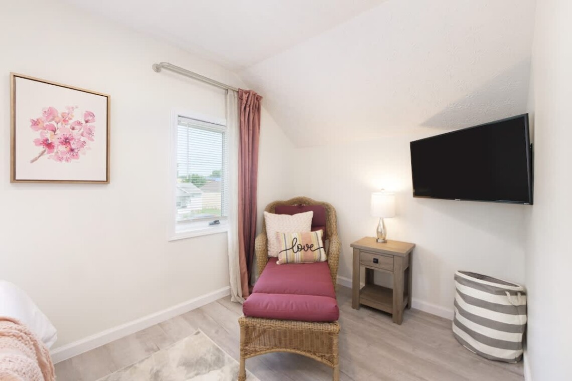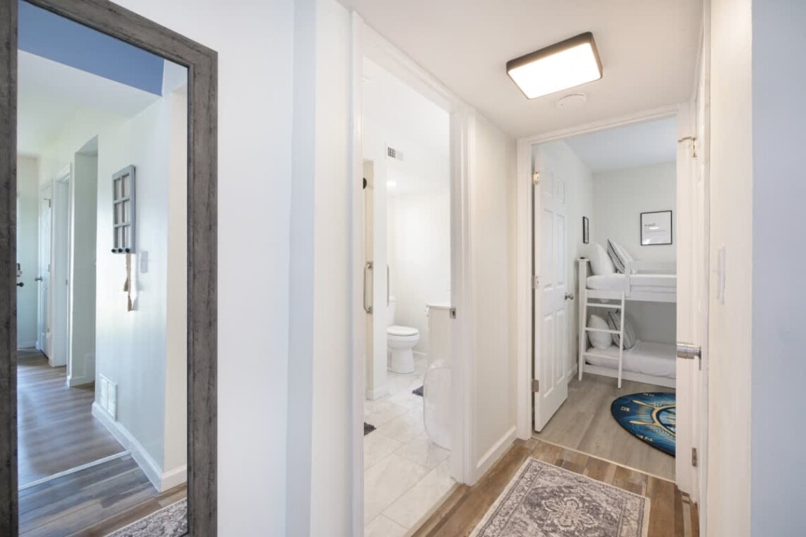 This home offers four bedrooms spread across two levels, accommodating up to 8 guests. On the first floor, one bedroom features a queen bed, while another has twin bunk beds. Upstairs, you will find two more bedrooms: one with a queen bed and the other with twin bunk beds. Each bedroom is equipped with its own TV for added convenience. A fully updated bathroom with a tub and shower combination is located on the main floor, stocked with essentials including towels, soap, shampoo, and a hair dryer.