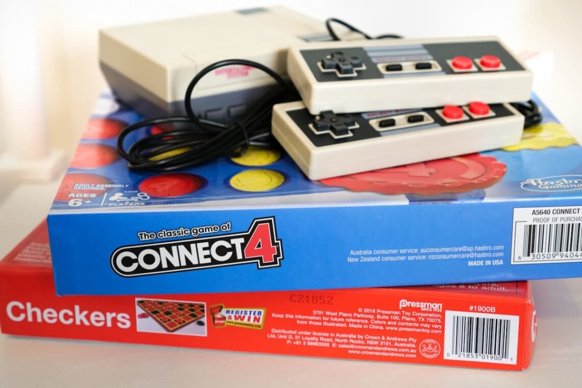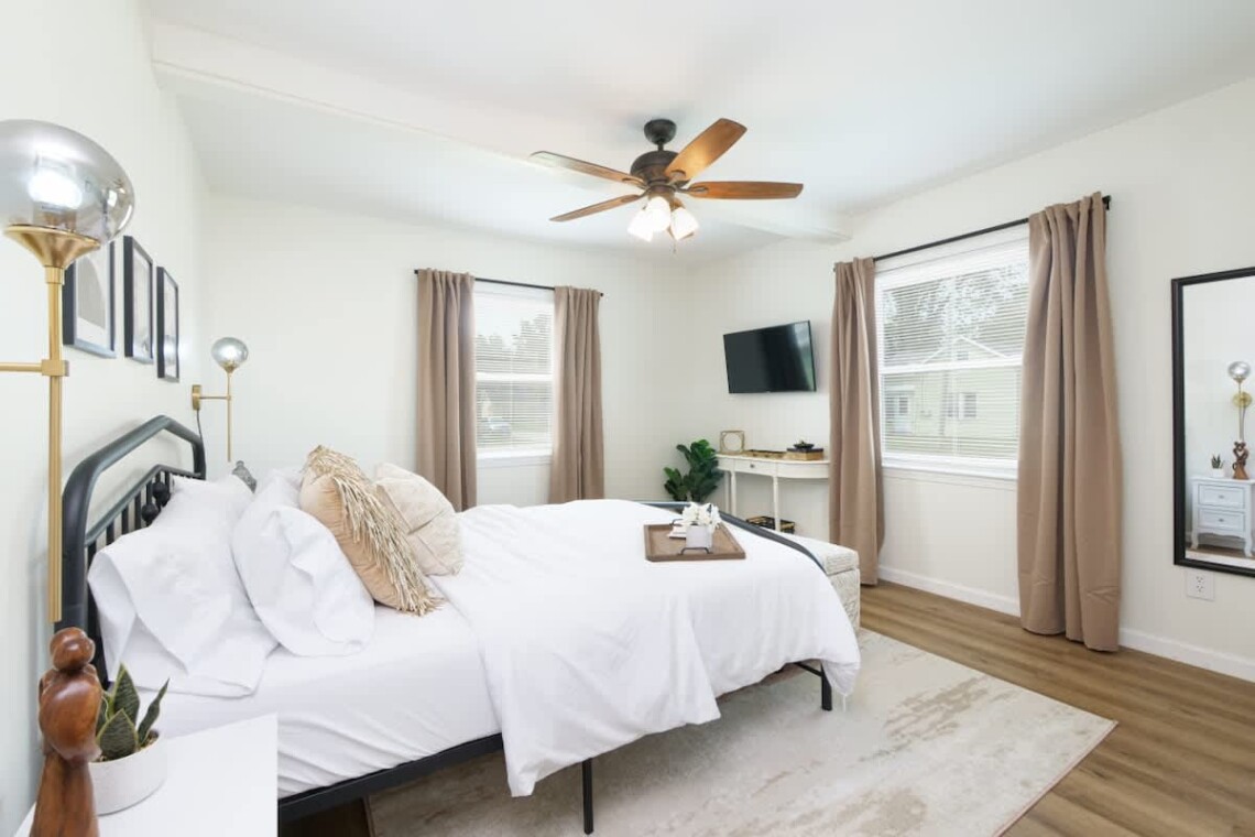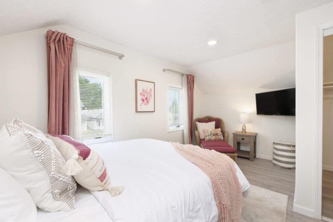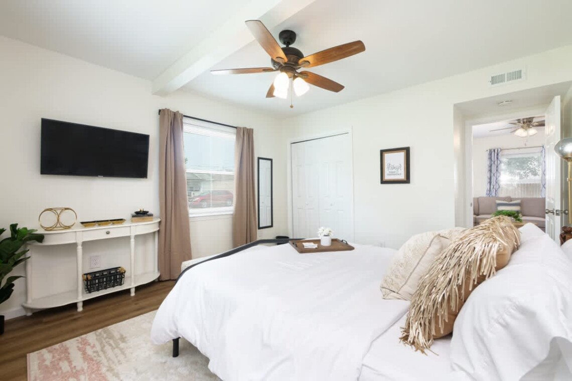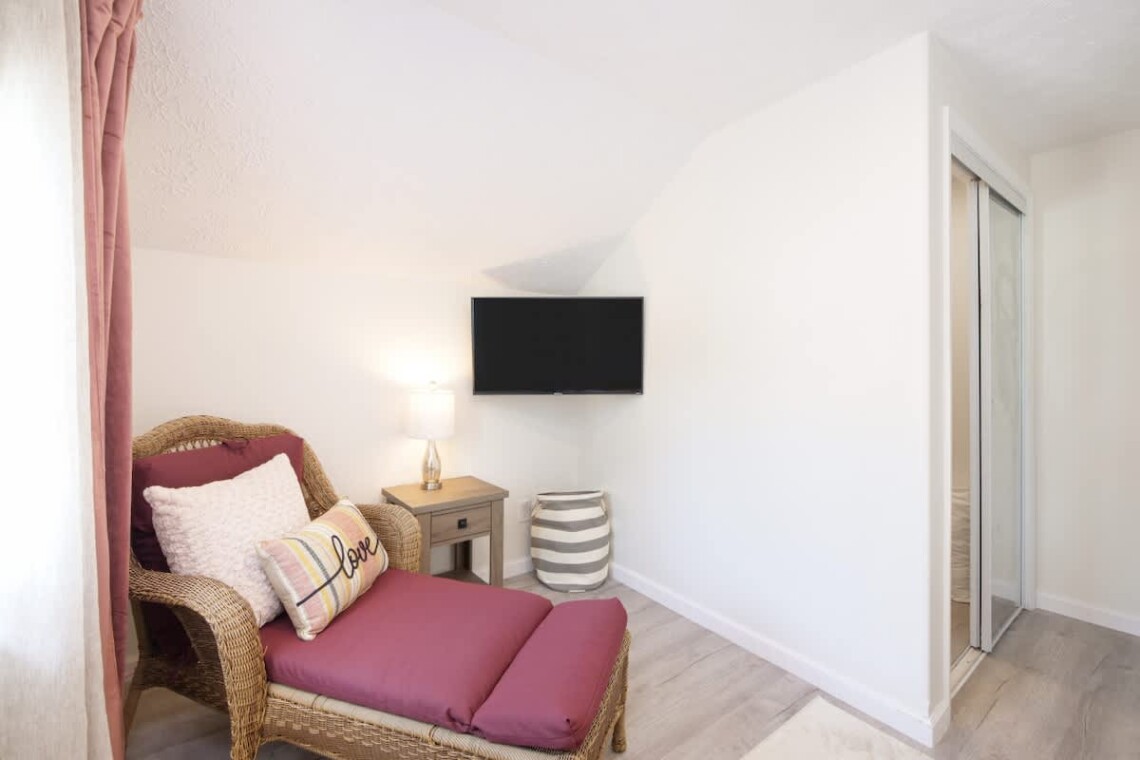 The main living room features a Smart TV and a retro Nintendo-style game console loaded with classic games. Central air conditioning and heating keep the home comfortable in every season, while room-darkening shades and extra pillows ensure restful sleep.
