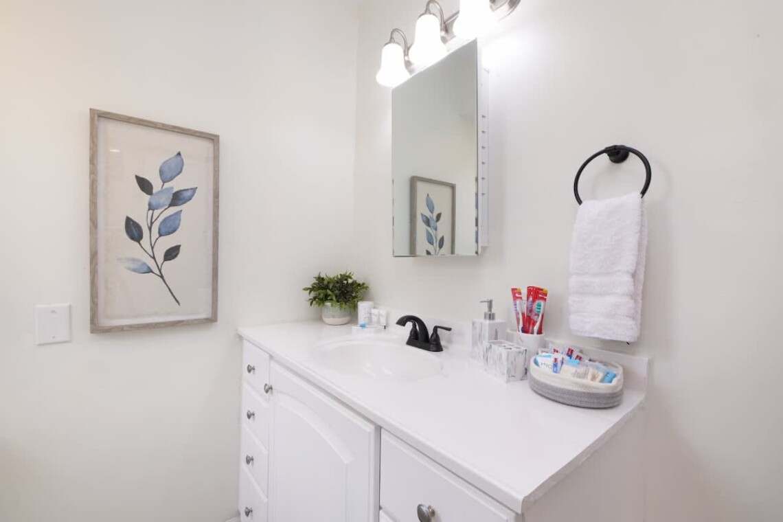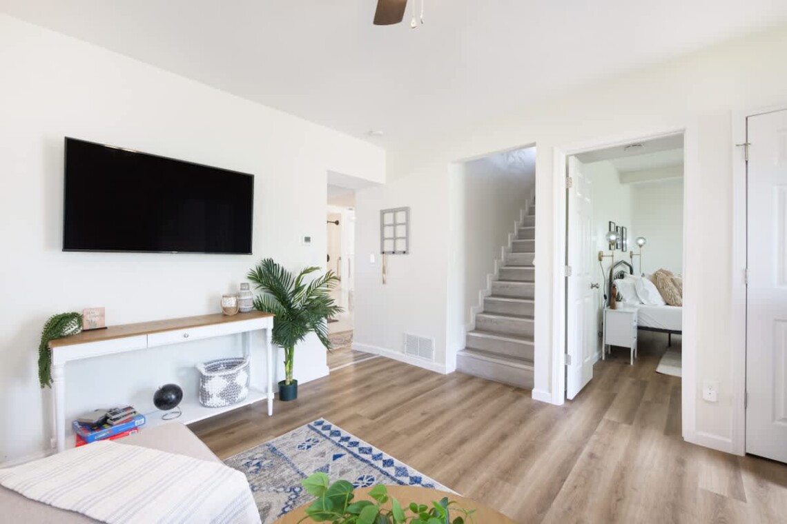 Guests have access to a free in-unit washer and dryer, free driveway parking, Wi-Fi with Ethernet connection, and self check-in via keypad. Essentials such as bed linens, cotton linens, hangers, iron, and clothing storage in closets and dressers are all provided. Safety features include a smoke alarm, carbon monoxide alarm, fire extinguisher, and first aid kit.