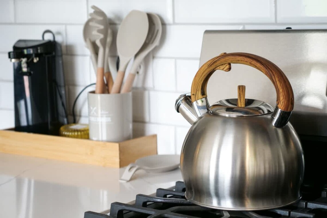The kitchen is outfitted with stainless steel appliances, including a Whirlpool gas stove, refrigerator, freezer, microwave, toaster, blender, and a Keurig coffee machine. Cooking basics such as pots, pans, oil, salt, and pepper are provided, along with dishes and silverware. An extendable dining table offers seating flexibility for shared meals.