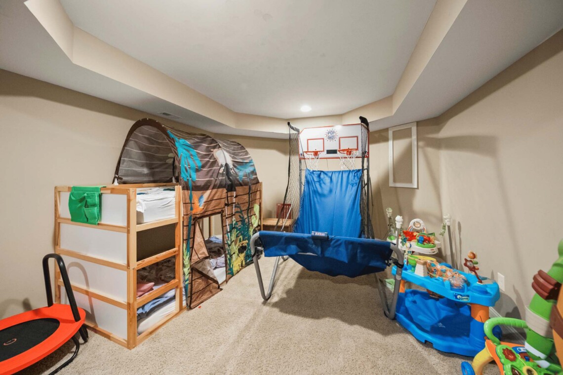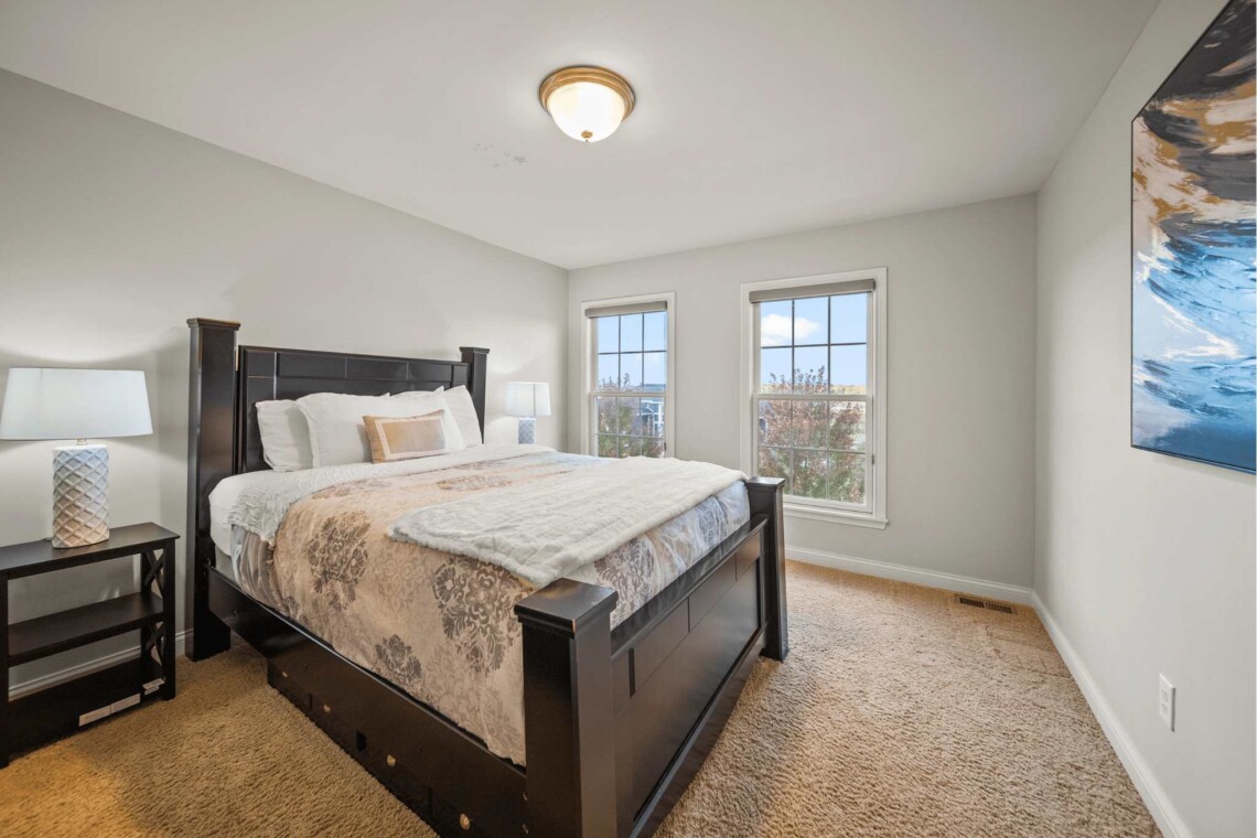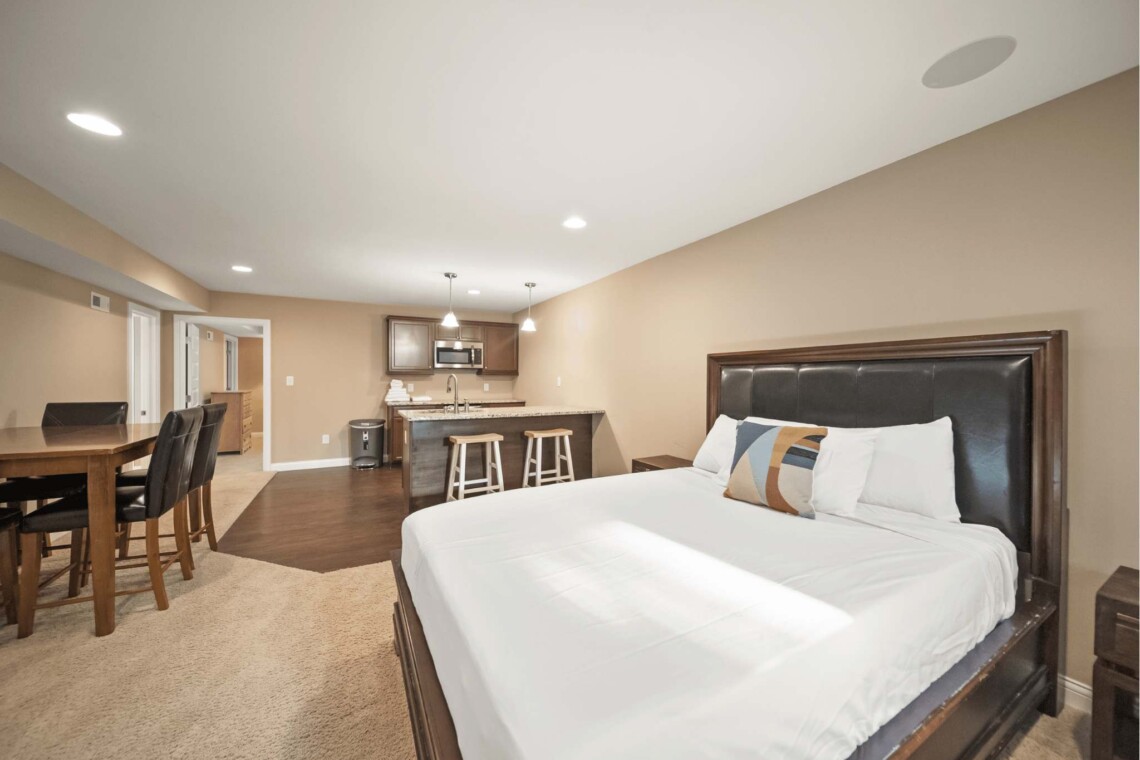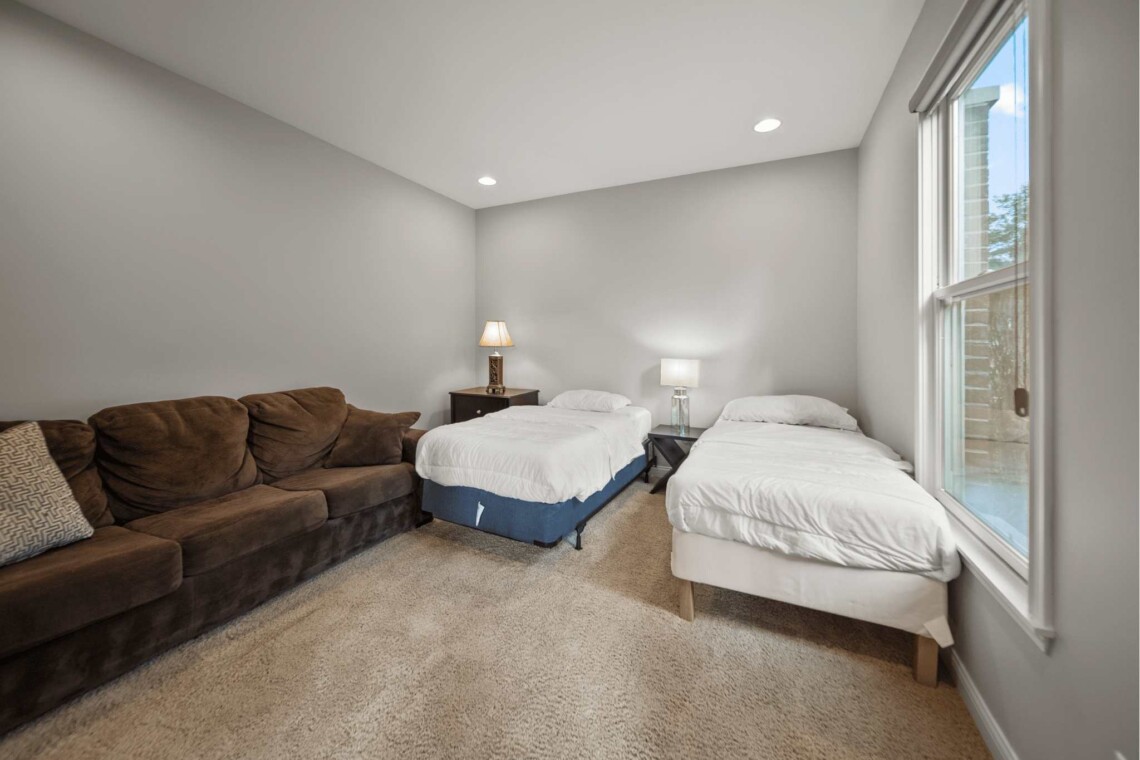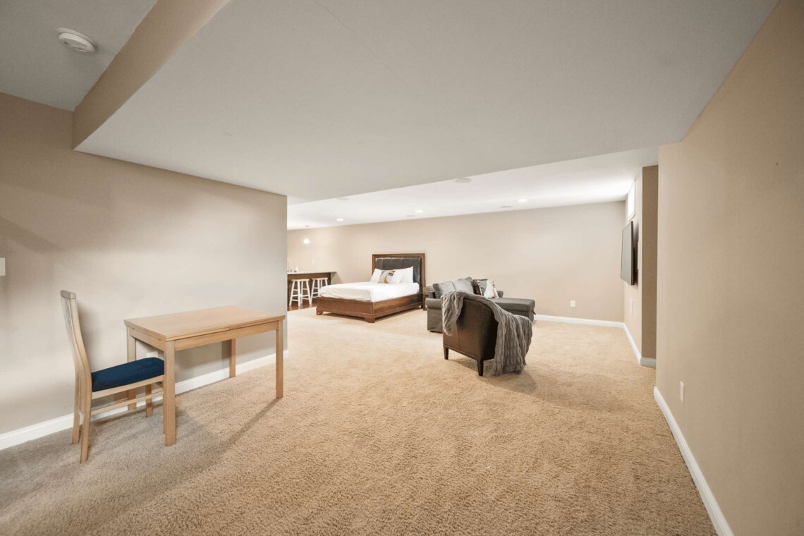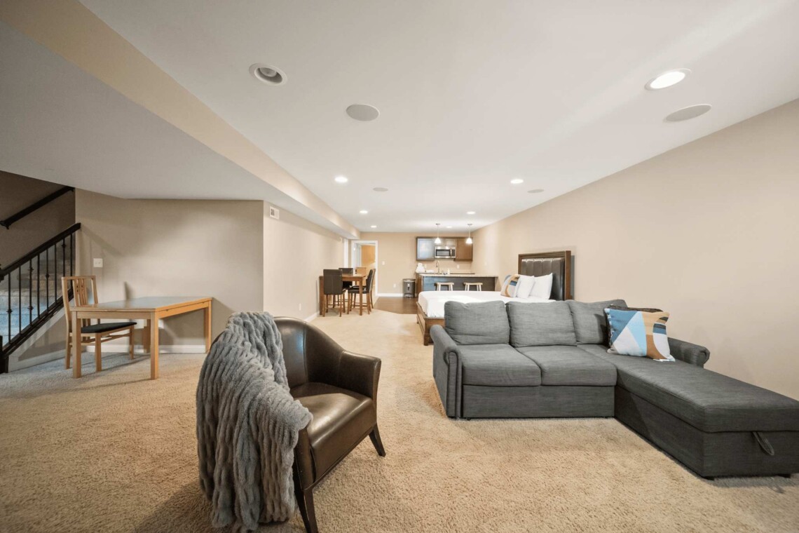 Multiple common areas make it easy to come together or find your own pace throughout the day. The main living room centers around an indoor fireplace, creating a cozy setting for cooler Indiana evenings. A finished lower level adds additional lounge space with a TV, offering flexibility for larger groups. Wifi and a dedicated workspace are available if you need to stay connected during your stay.