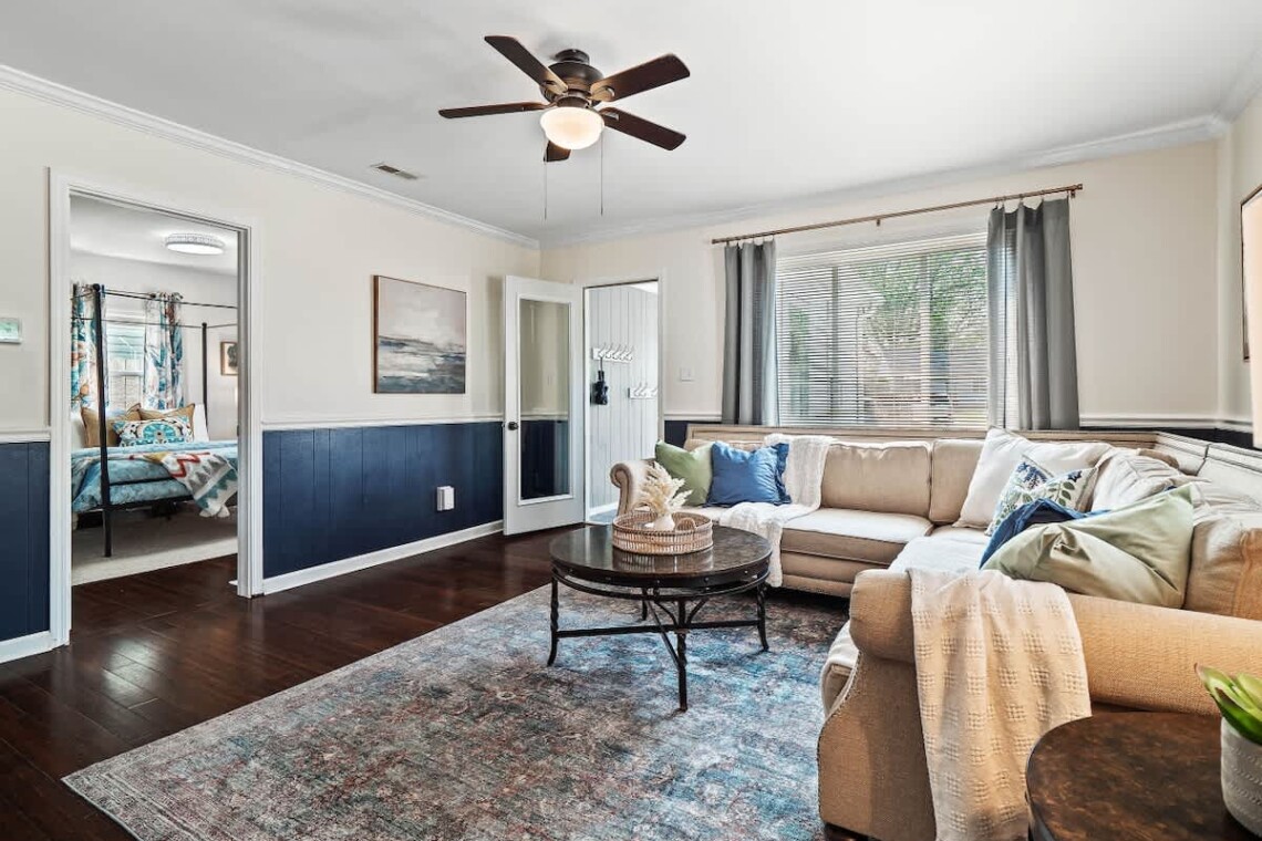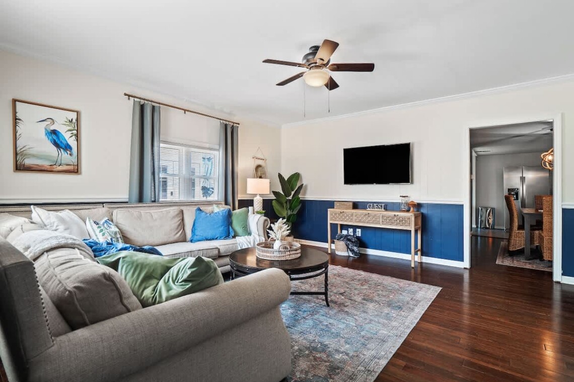 The main living area welcomes you with a spacious sectional couch and a 43-inch HDTV, perfect for gathering after a day outdoors. A dedicated workspace with a door and high-speed Wi-Fi (206 Mbps) ensures you can stay connected or take calls in privacy.
