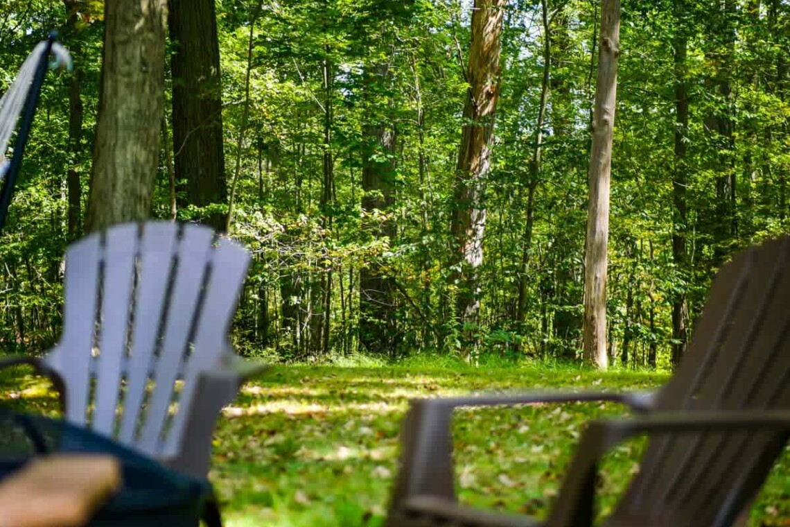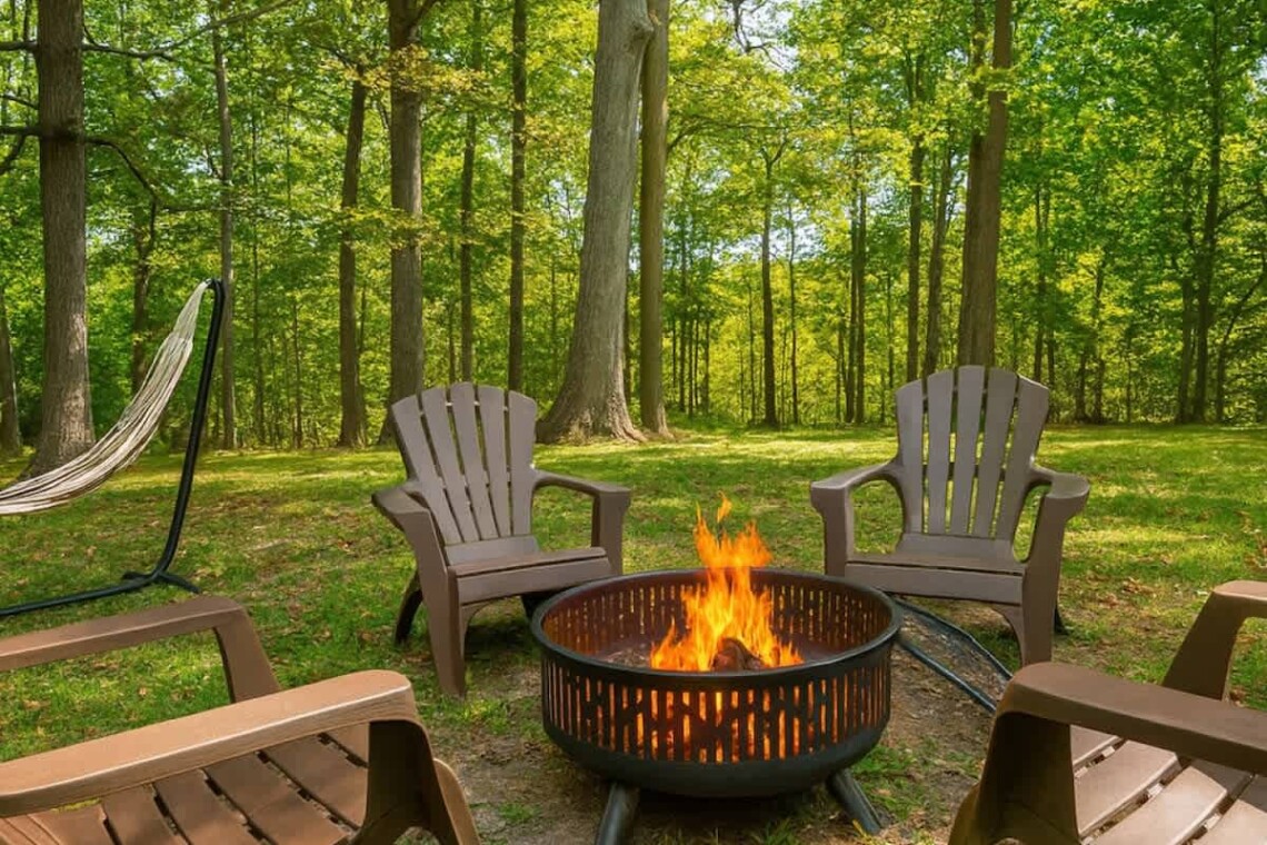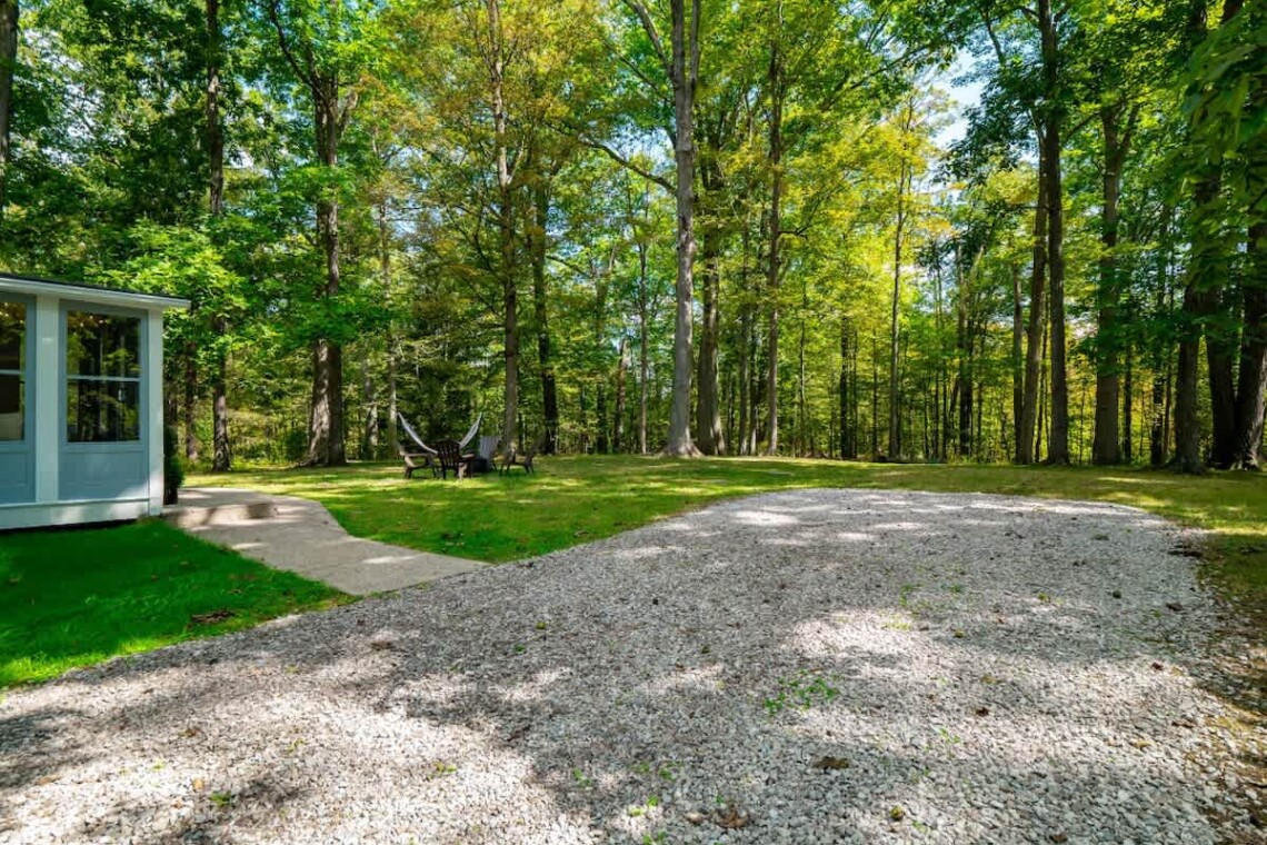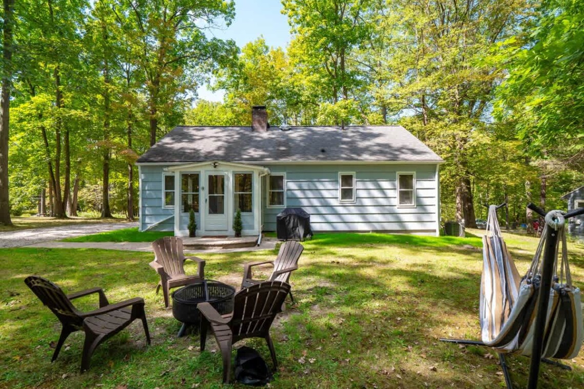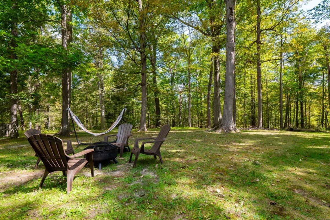 Step outside to enjoy the peaceful surroundings. Relax in the hammock, gather around the fire pit (bring your own wood), or fire up the propane grill for a cookout. The long driveway provides plenty of parking, and the front porch with chairs is a perfect spot for your morning coffee.