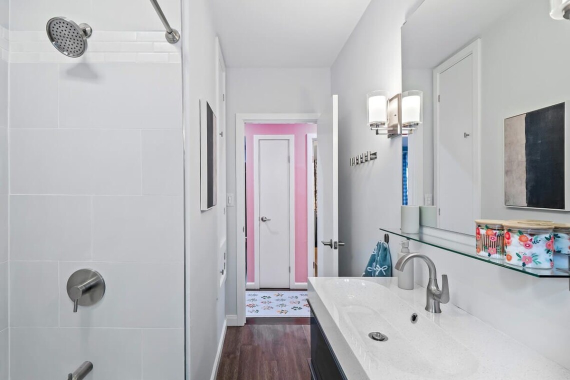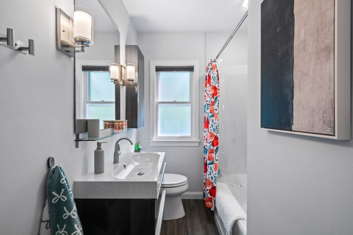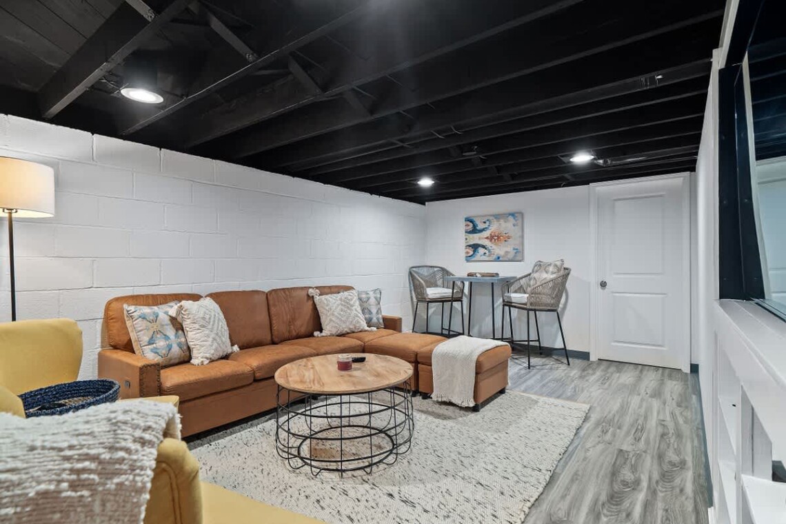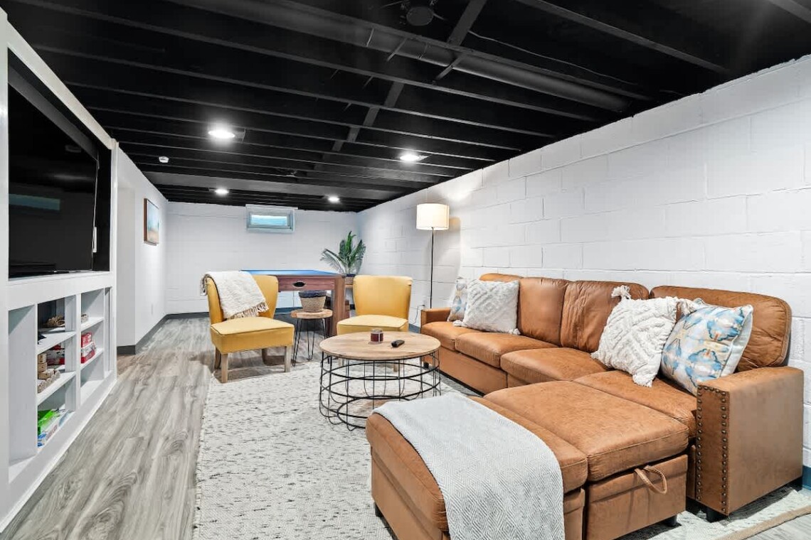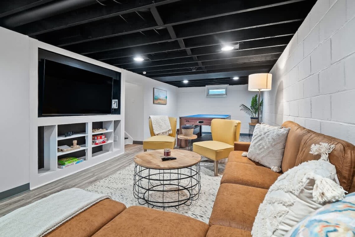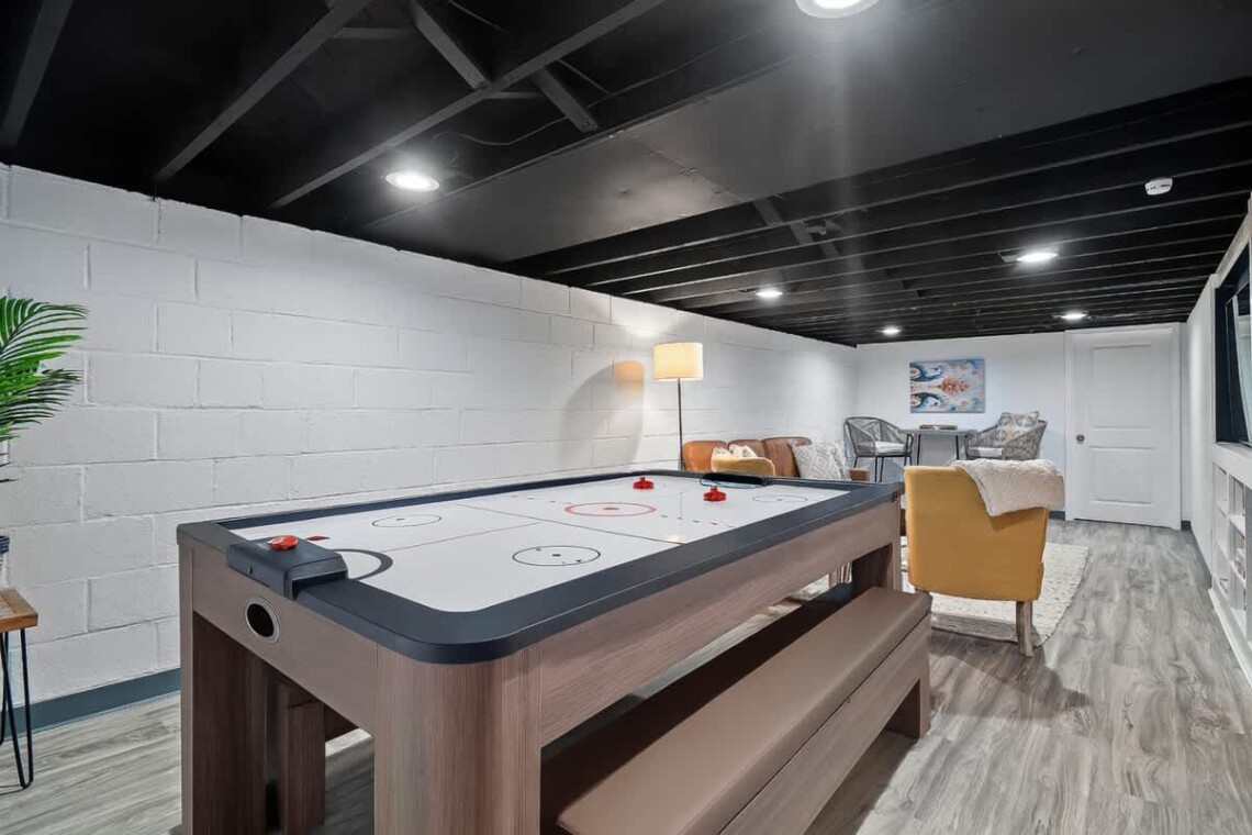 The finished basement is made for fun, featuring a game room with a ping pong/air hockey table, a cozy couch with TV, and plenty of board games. Laundry is also available for guest use.