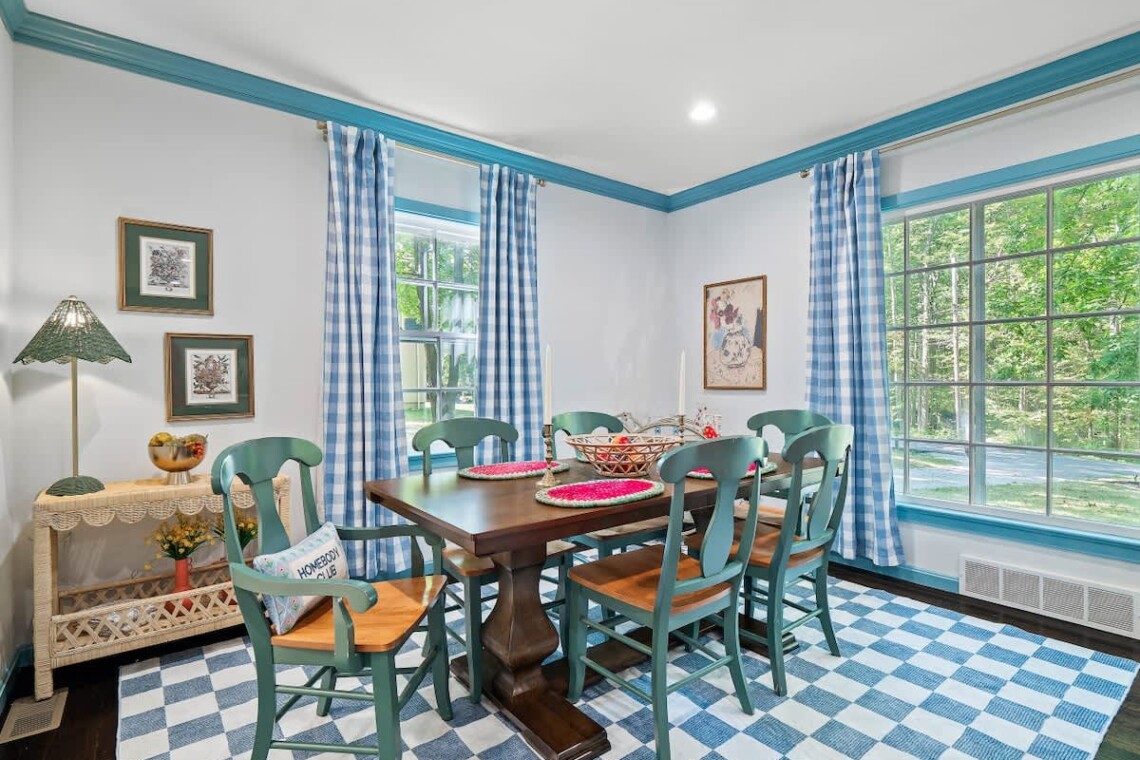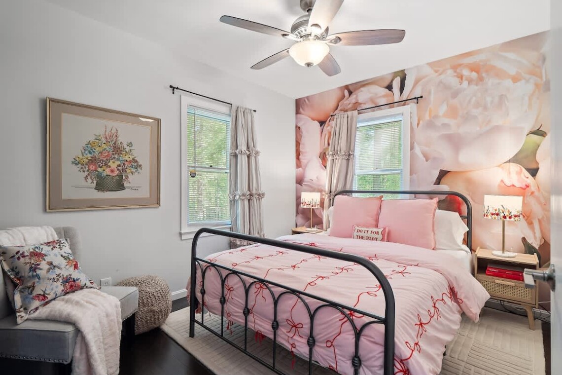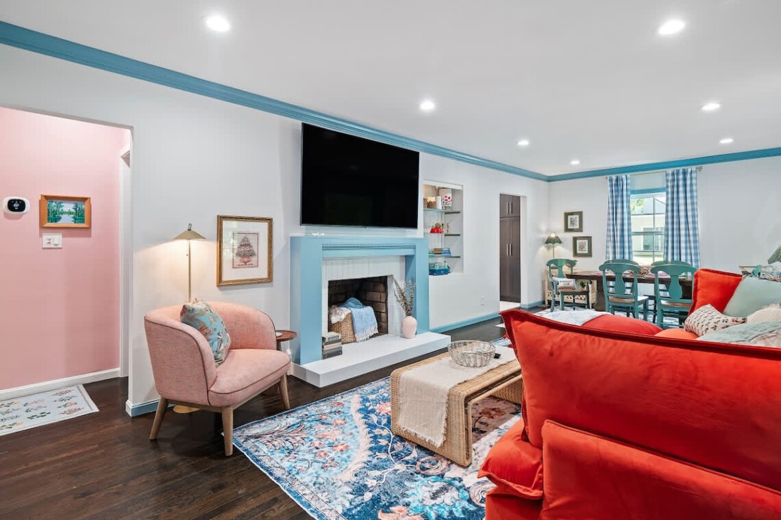 Inside, you’ll find a fully stocked kitchen complete with a coffee bar (coffee, sugar, creamer, syrups provided) and all the essentials for home-cooked meals. The dining area has seating for 6 and a bar cart. The cozy living room is perfect for relaxing and features a Smart TV and adorable decorative fireplace. The inviting living spaces include a full bathroom with a tub/shower combo and 3 comfortable bedrooms: